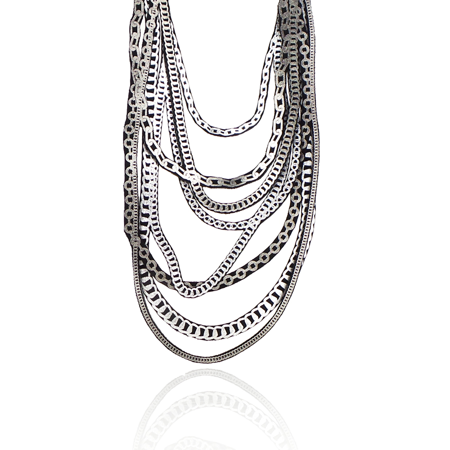 Le collane, le spille e gli orecchini di Uli interpretano l’amore per le pietre preziose antiche e le perle in contrasto con le grosse catene.
