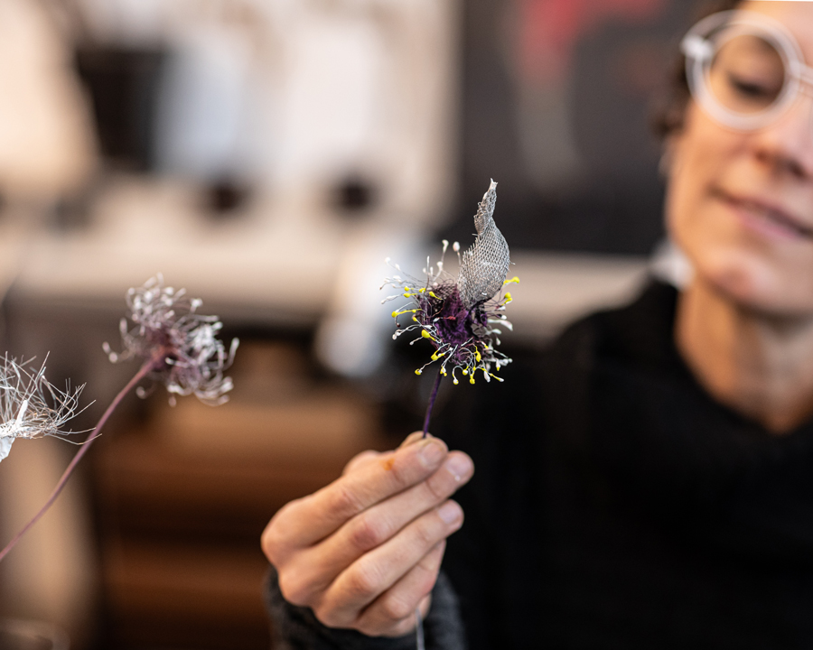 Nell’installazione “Pioniera” e nelle piccole sculture dei fiori Indispensabili, Raffaella unisce tecniche artigianali e materiali tradizionali con la tecnologia
