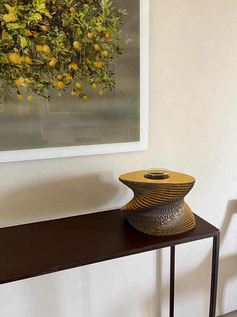 Sculture sospese, tavoli dalle forme sinuose, sculture che racchiudono vasi.