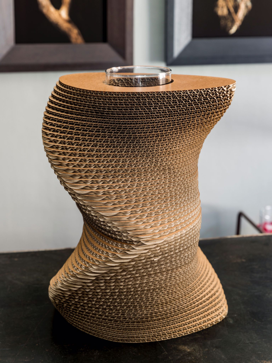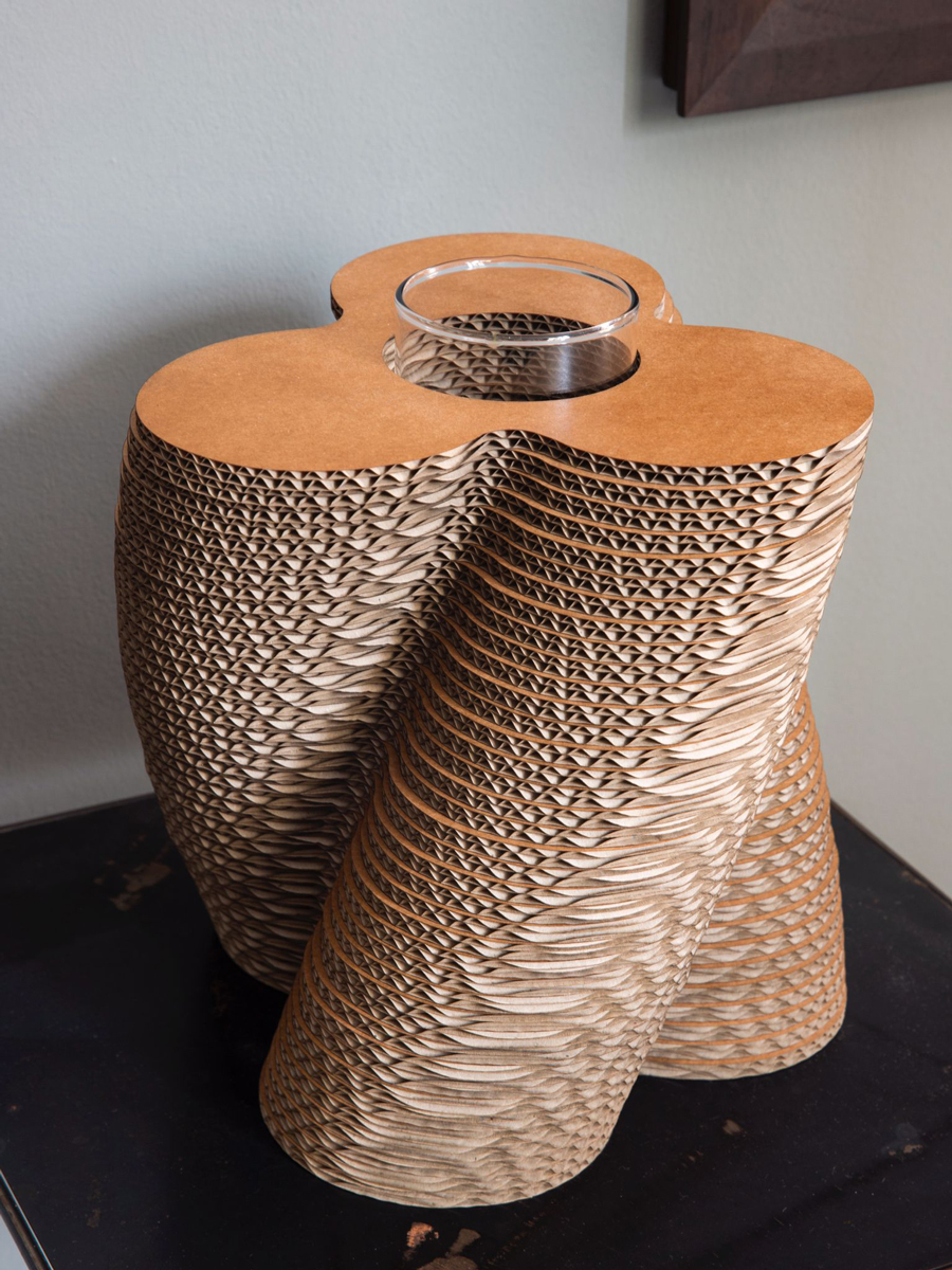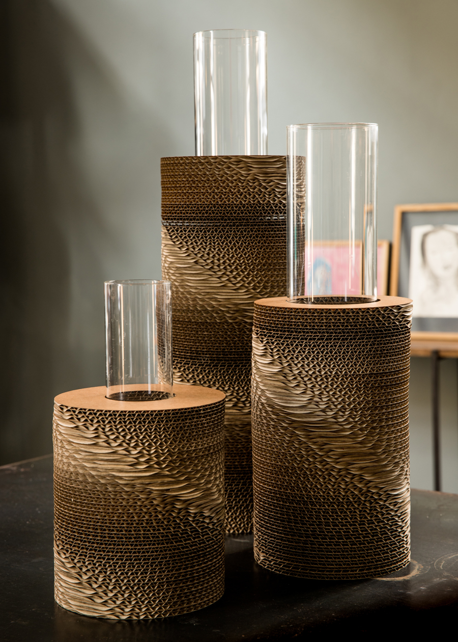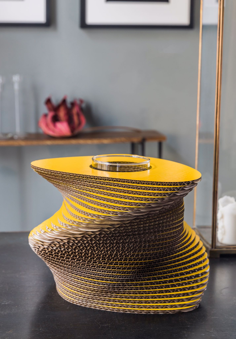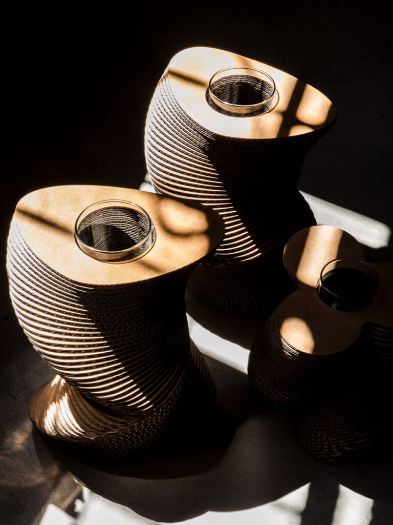 Il progetto realizzato in cartone doppia onda gioca con sovrapposizione, volume e forma della materia.