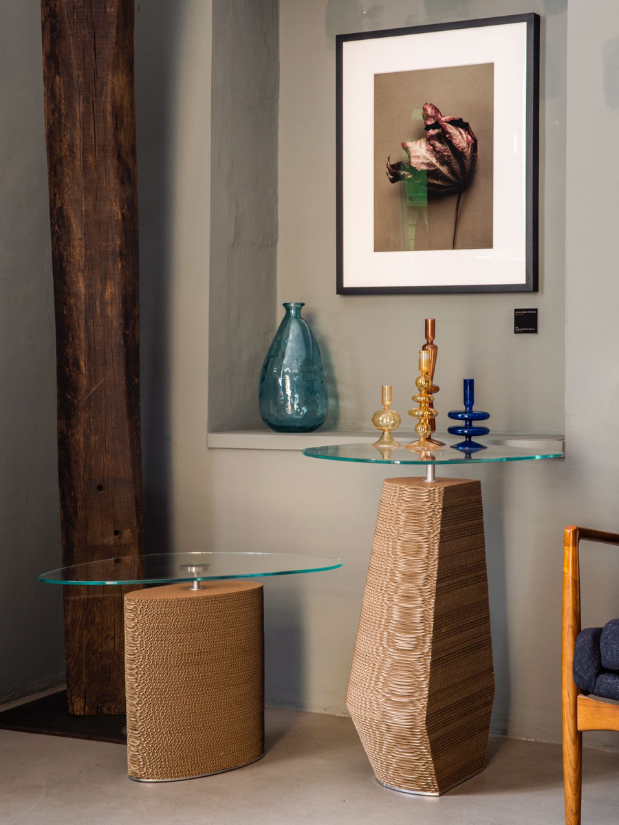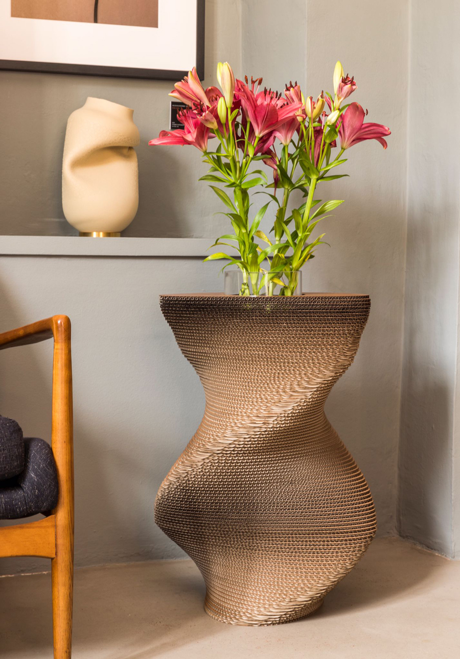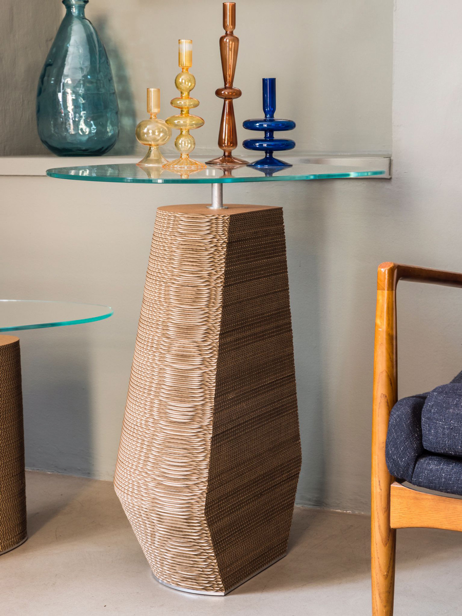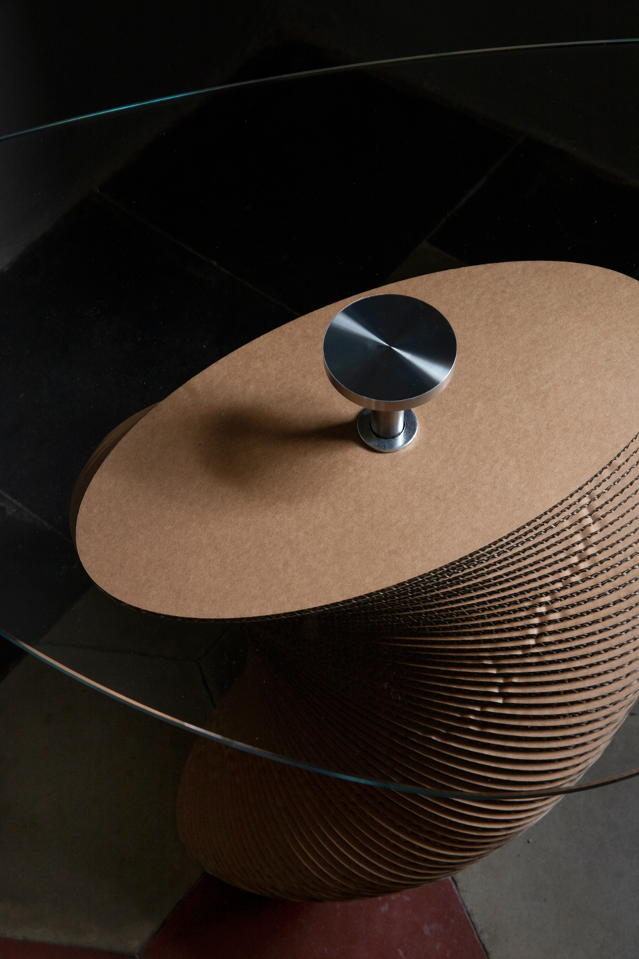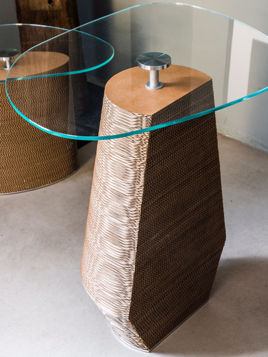 Il progetto realizzato in cartone doppia onda gioca con sovrapposizione, volume e forma della materia.