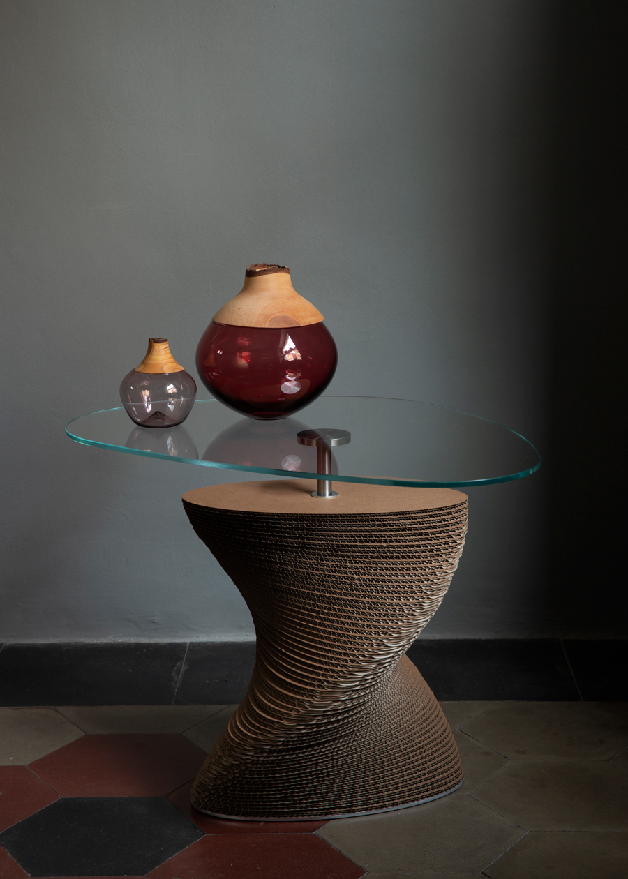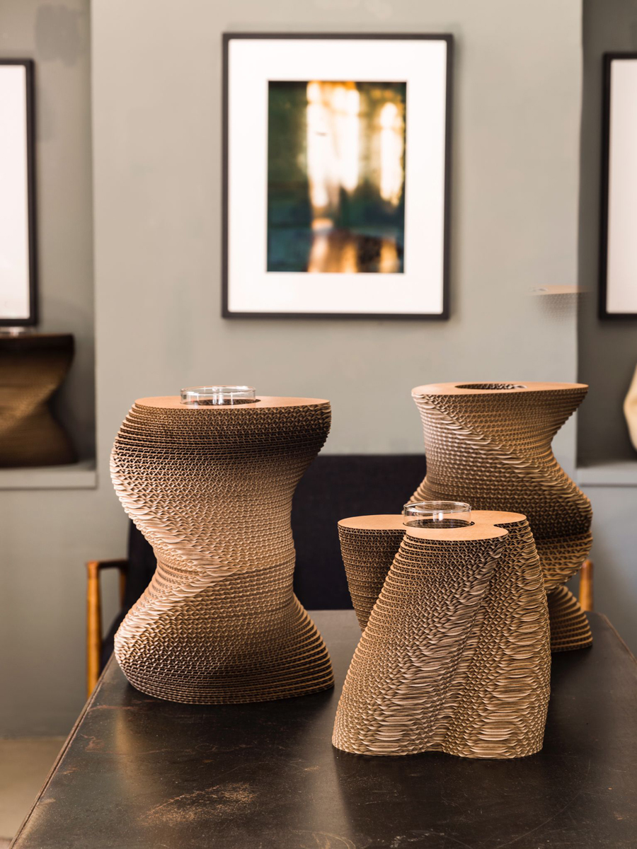 Le caratteristiche della materia vengono espresse in tutto il loro potenziale. Il cartone muta dalla linea alla curva, dalla retta alla sfera per trasfigurare da strato in opera.