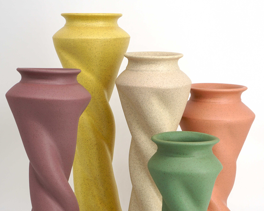 A collection of ceramic vases, shaped on a wheel and glazed with an airbrush. The series boasts sinuous silhouettes inspired by chrysalises in the transformation from caterpillar to butterfly. Crisalide is a combination of traditional techniques and contemporary taste. The vases come in nine shapes and six color variations: yellow, red, blue, purple, white, and black.