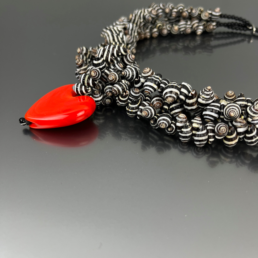 The necklace is made with borosilicate glass elements and titanium rings.