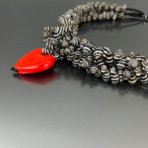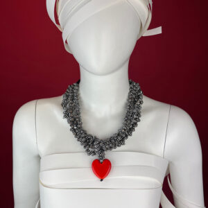 Necklace with glass beads, small shells, and a heart-shaped element, handcrafted using the lampwork technique in Marina and Susanna Sent’s Murano workshop.