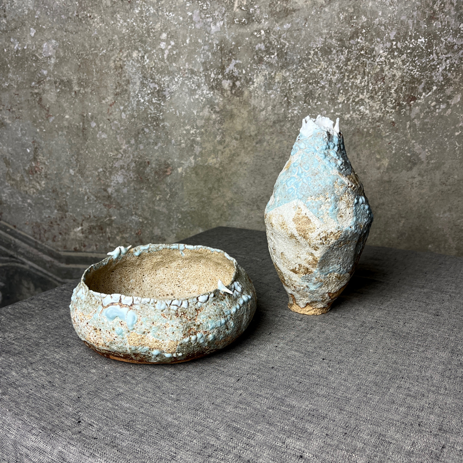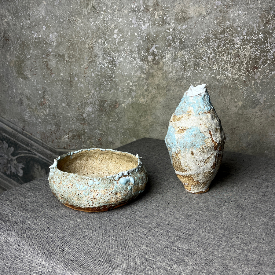 Vase and bowl, a pair of sculpture pieces modeled entirely by hand in stoneware and porcelain.