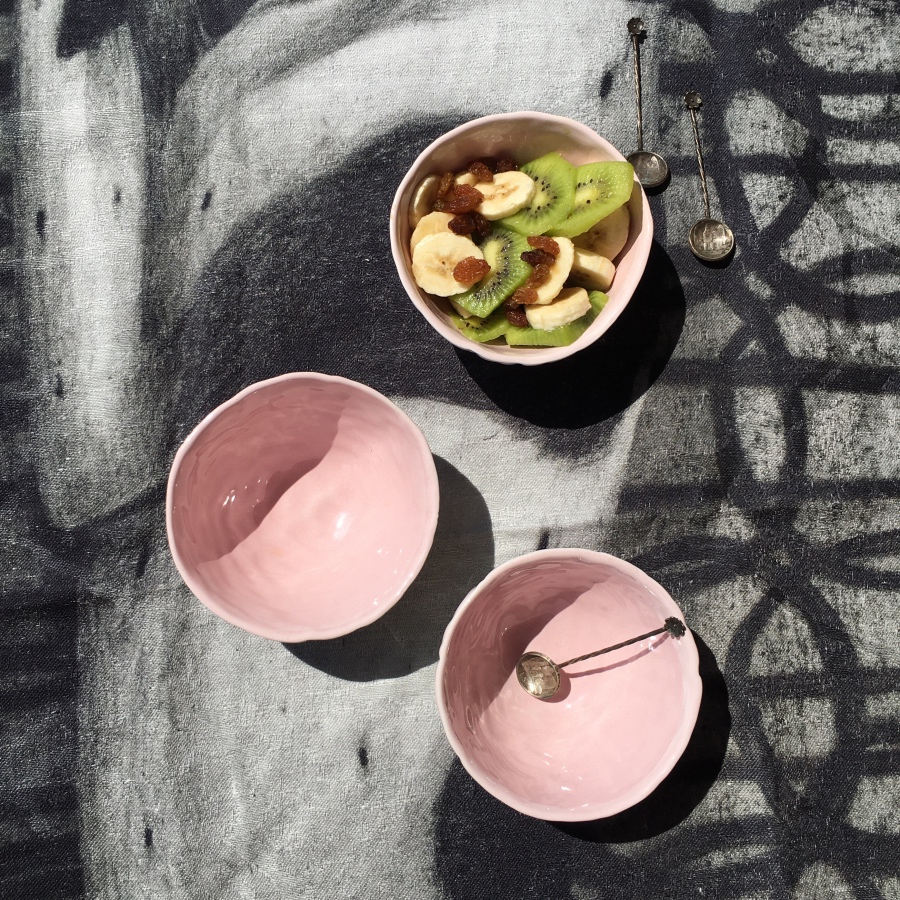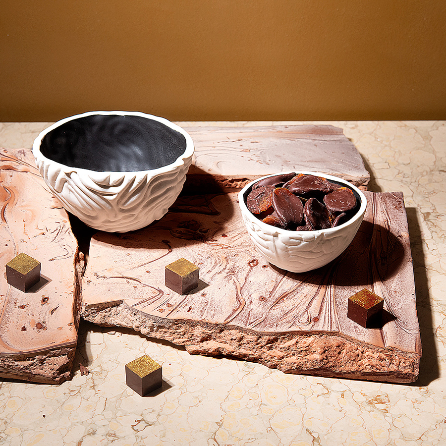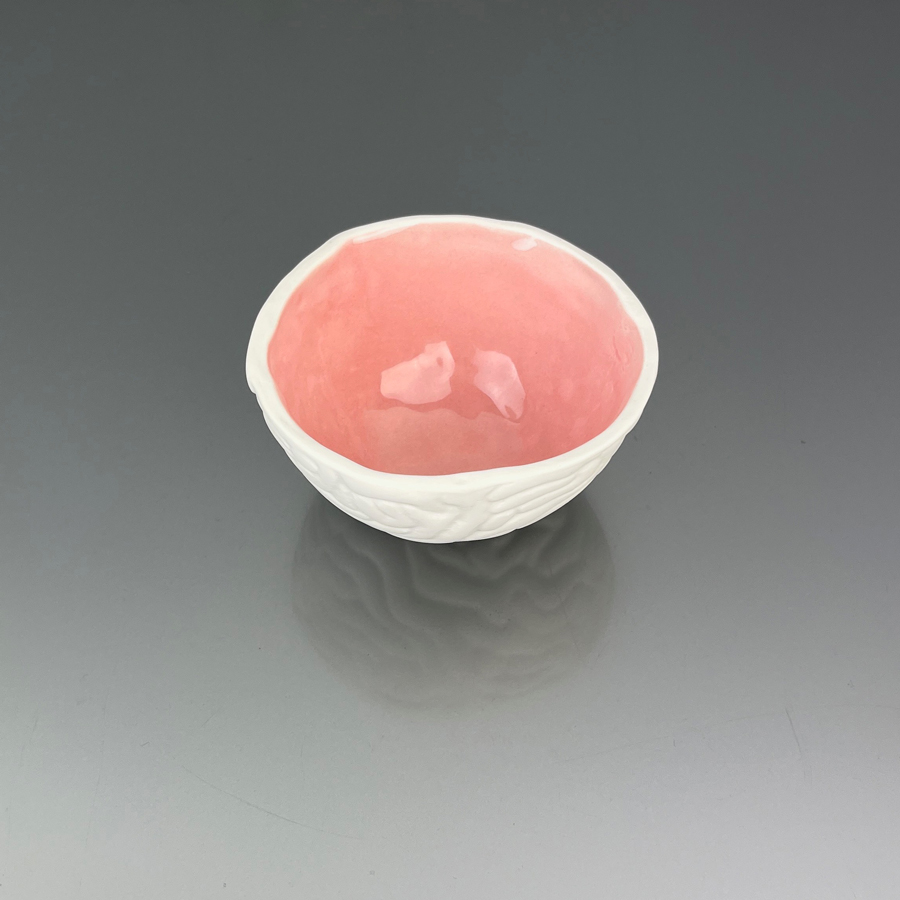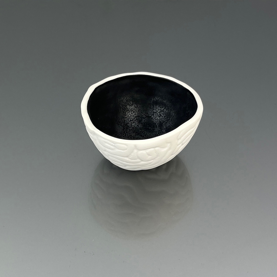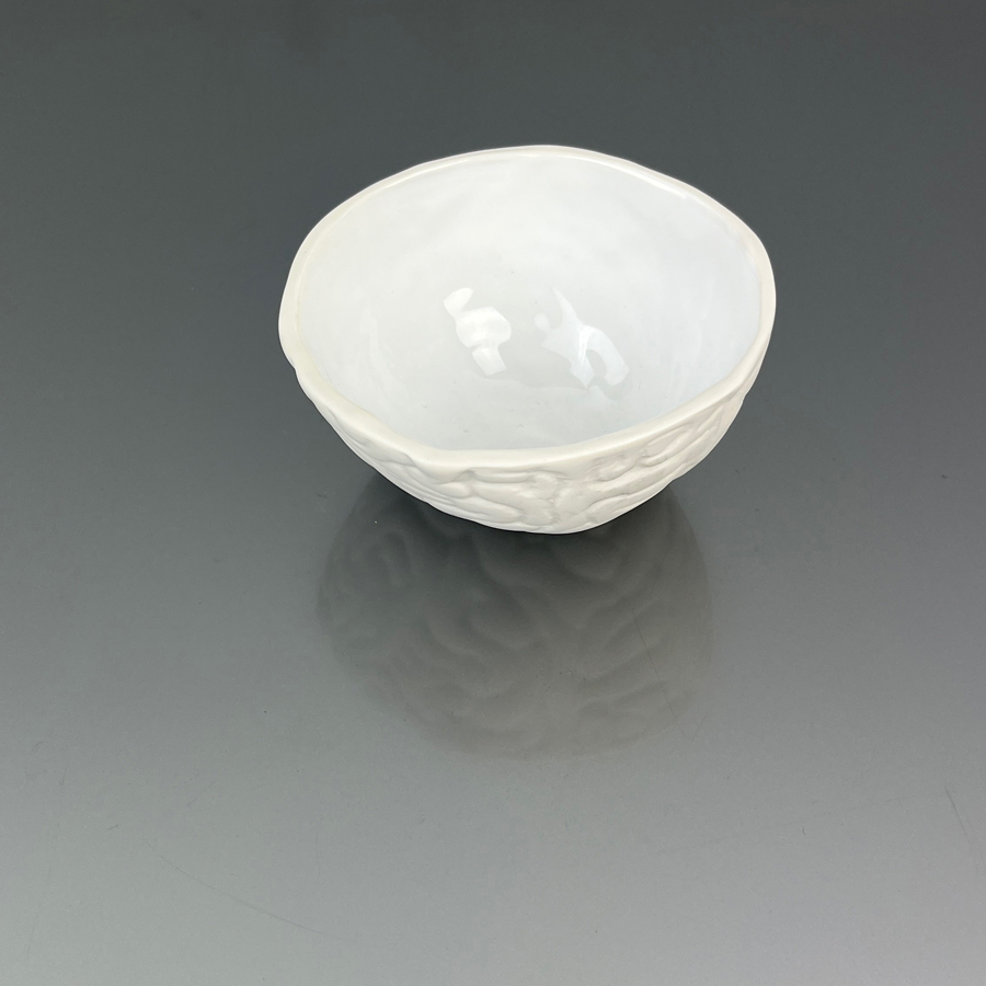The brain bowls are made in Limoges porcelain, glazed on the inside and left in biscuit on the outside.