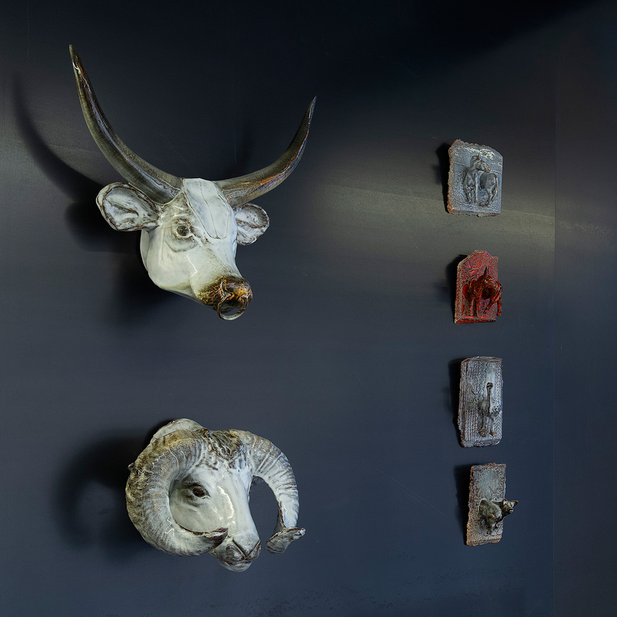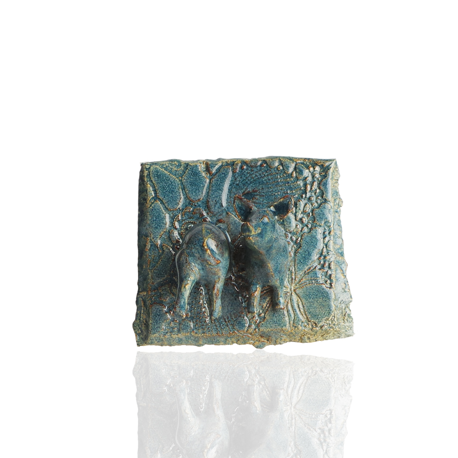 Ostriches, horses, elephants, giraffes, lions, monkeys, deer, dogs, cows, pigs, etc… enter and exit the ceramic plates.