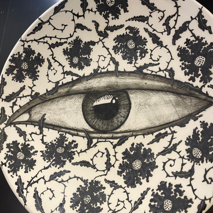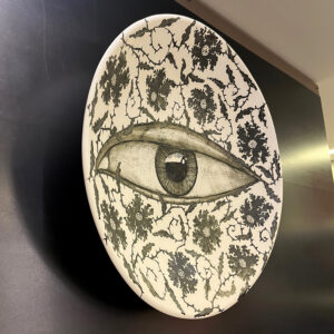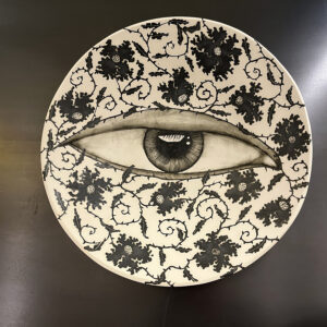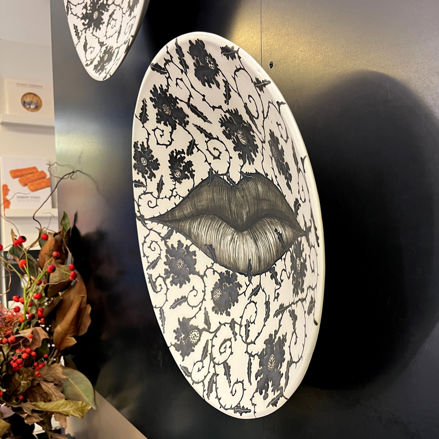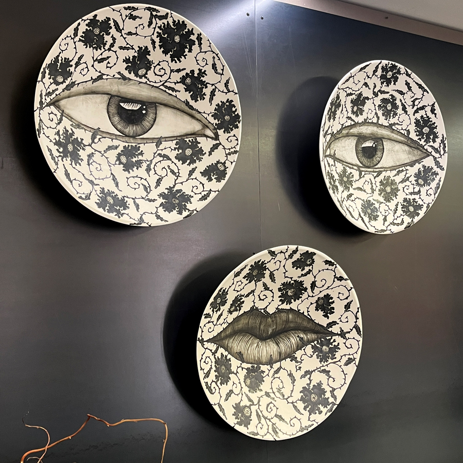 Historically, ceremonial plates were large ornamental dishes: they were hung to display pomp and taste. Here, the idea returns, but with a different language. They don’t celebrate a banquet: they celebrate the gaze. The wall becomes a face, the room becomes a stage.