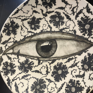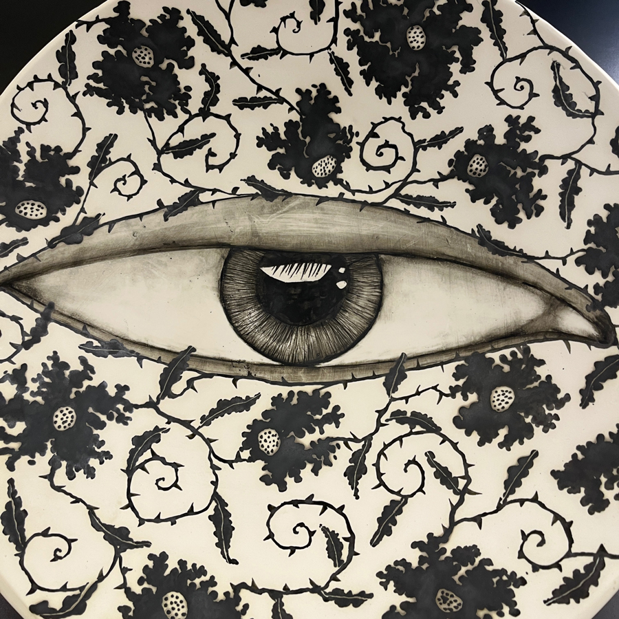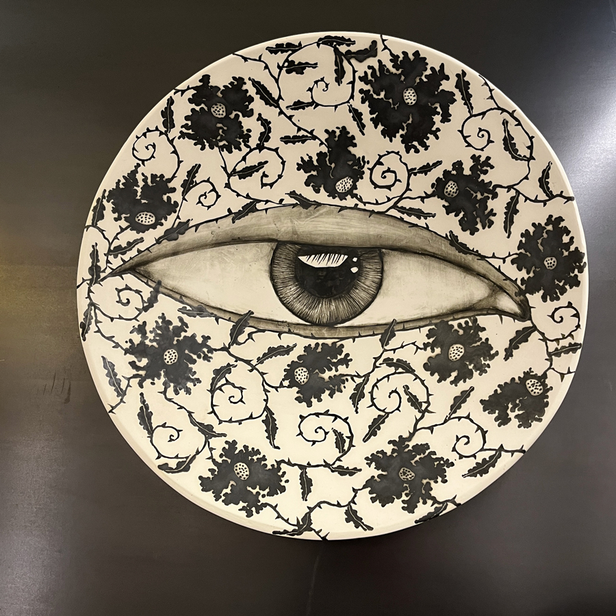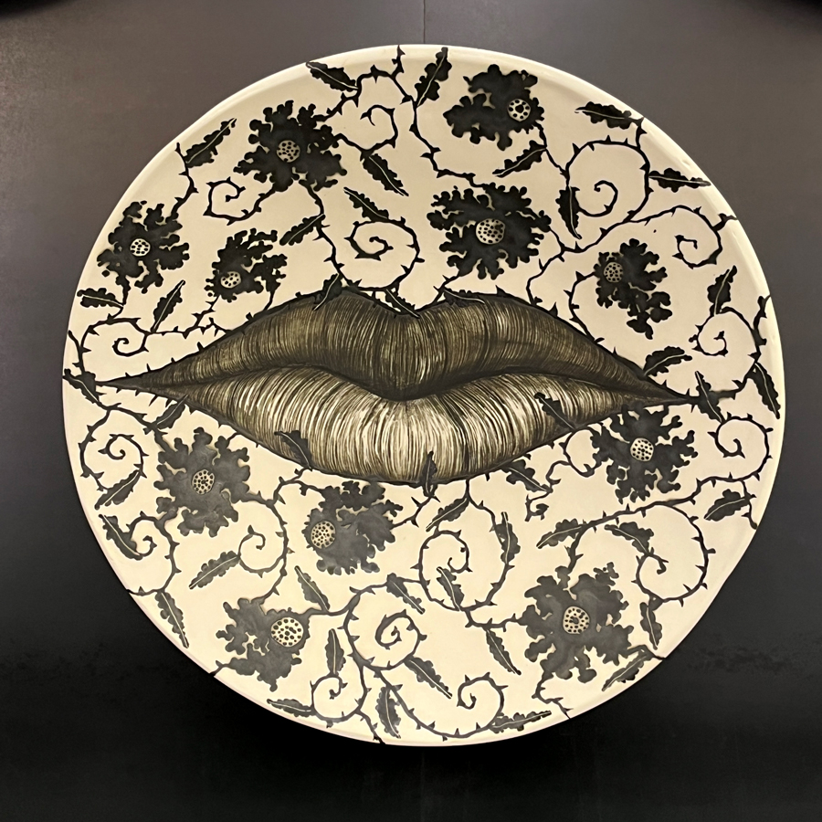 The surface of the plates is animated by a floral pattern that passes through the gaze and lips, like a thin veil. On the textured porcelain, the painting conveys the artist’s gesture.