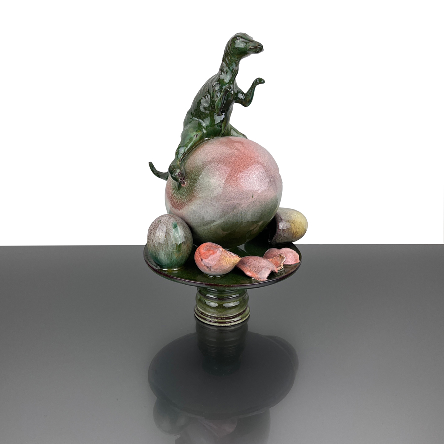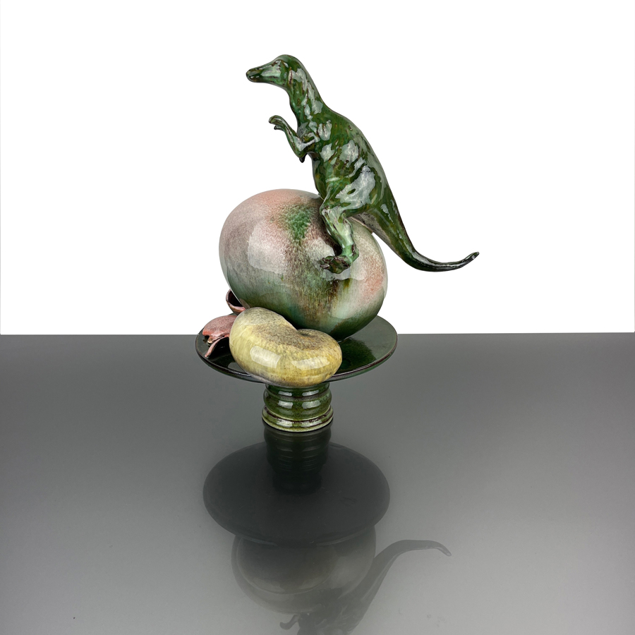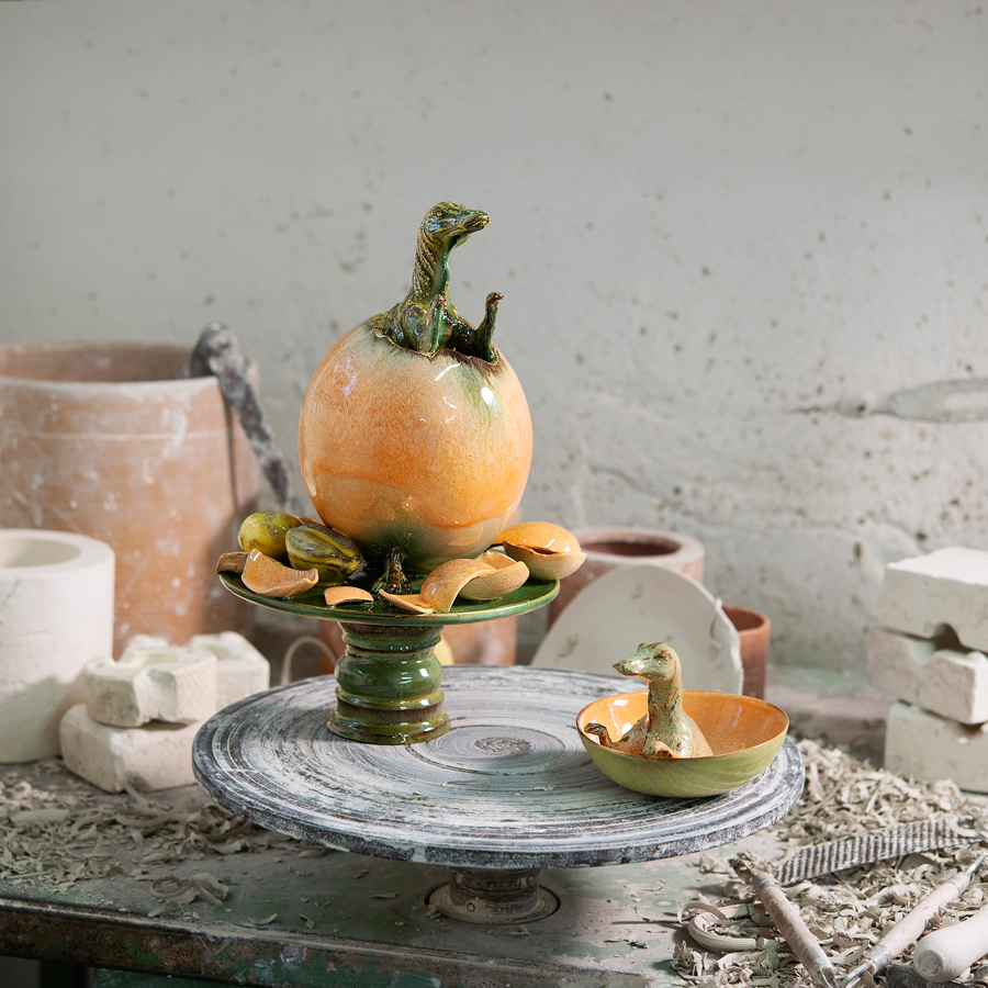 The sculpture centerpiece with Dino, eggs and shells is in glazed ceramic, the pieces, even if reproduced, are made entirely by hand and therefore are never identical. The glaze drips are a feature of the workmanship.