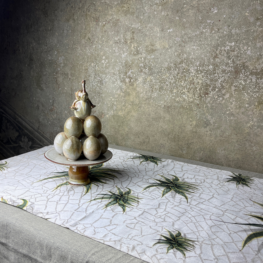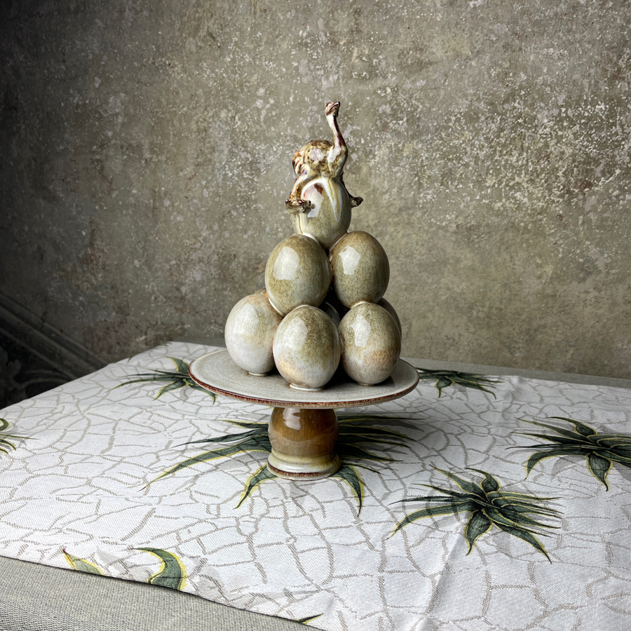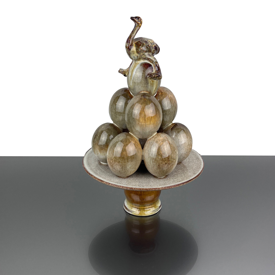 The ostrich sculpture centerpiece with eggs is in glazed ceramic, the pieces, even if reproduced, are made entirely by hand and therefore are never identical. The glaze drips are a feature of the workmanship.