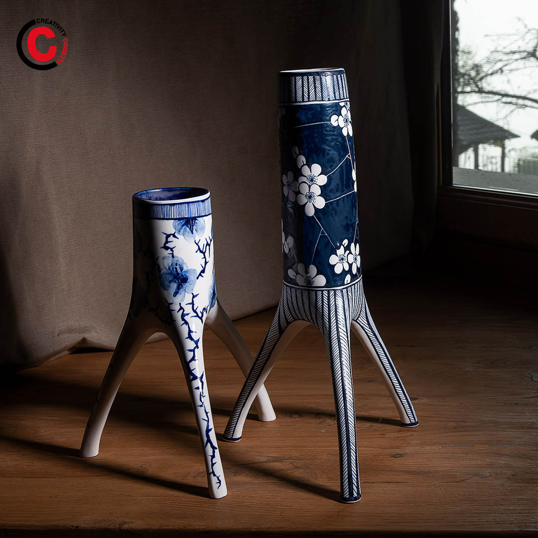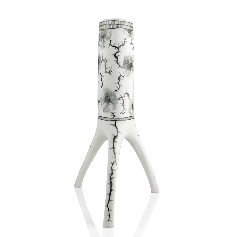 The tripod vases are unique pieces, completely handmade in Limoges porcelain and decorated with a brush by Elica Studio. they are inspired by nature, recalling mangroves, trunks and stylizations of natural elements. They can be used as flower pots.