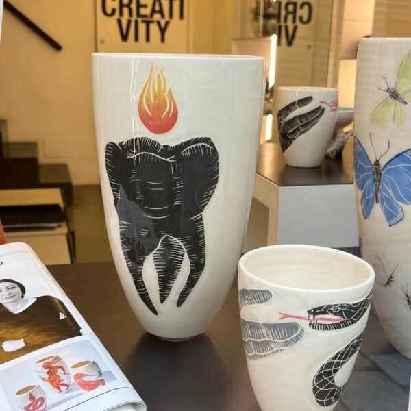 Crafted on a wheel and entirely hand-decorated, the new ceramic vases from Elisabetta D’Arienzo’s (Little Freak) “Graffiti” collection embody the unpredictability of the mark and the narrative power of the image. Each surface is a page waiting to be written, punctuated by esoteric symbols, imaginary figures, and minimal details that, like fragments of a story, recompose themselves in an ever-changing balance.