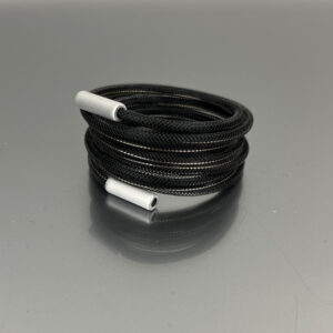 Bracelet without clasp, simply rolls around the wrist. Easily fits all sizes. Nylon mesh with a colored silk cord inside and a harmonic steel wire that makes the bracelet very easy to wear. The ends are in aluminium.