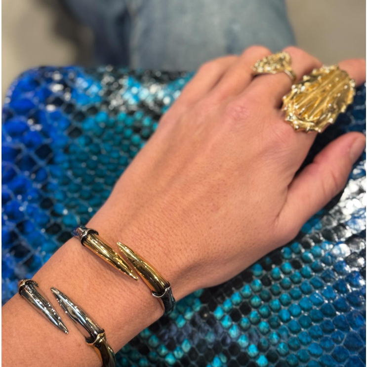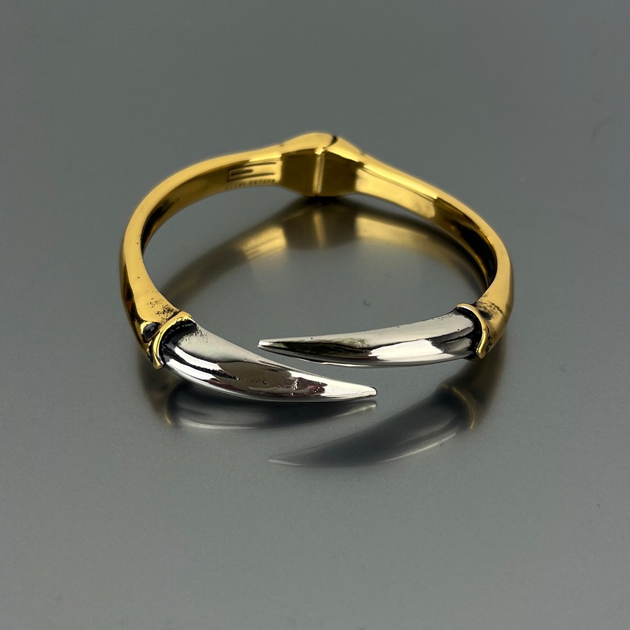Gold-plated and silver-plated bronze bracelet with spring clasp. Internal measurement: height 4.5 cm, width 5.5 cm
