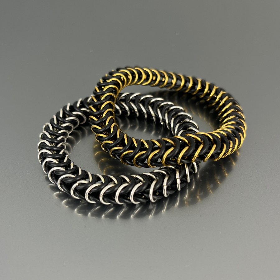 Mesh bracelet with gold-plated or silver-plated brass rings and rubber.