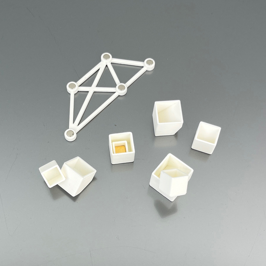 The brooch is composed of an element with 5 small magnets and 5 geometric elements, each with a magnet. You can have fun composing the brooch as you like, creating unique combinations that reflect your style.