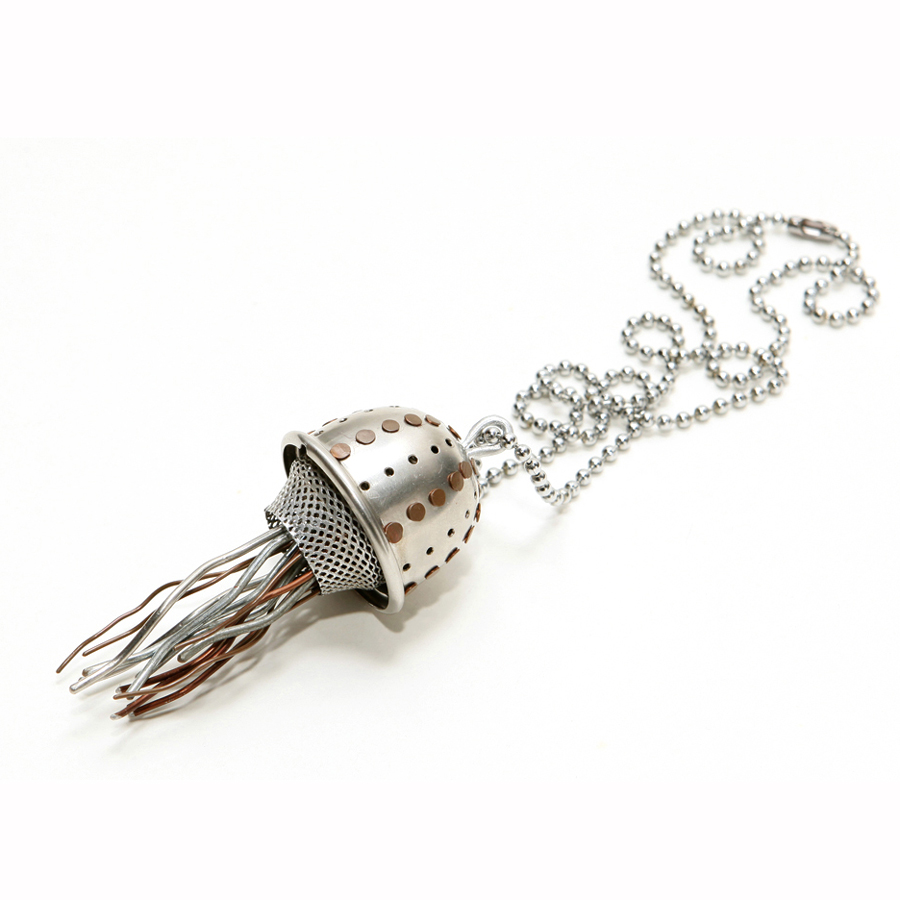 This necklace is crafted entirely by hand by assembling a filter from thè stainless steel with copper rivets and aluminum mud flaps for coffee machine. The stems are copper, aluminum, anodized aluminum and bicycle spokes. The chain is in chrome-plated brass. Any small imperfections are a typical feature of the piece only produced craft.
