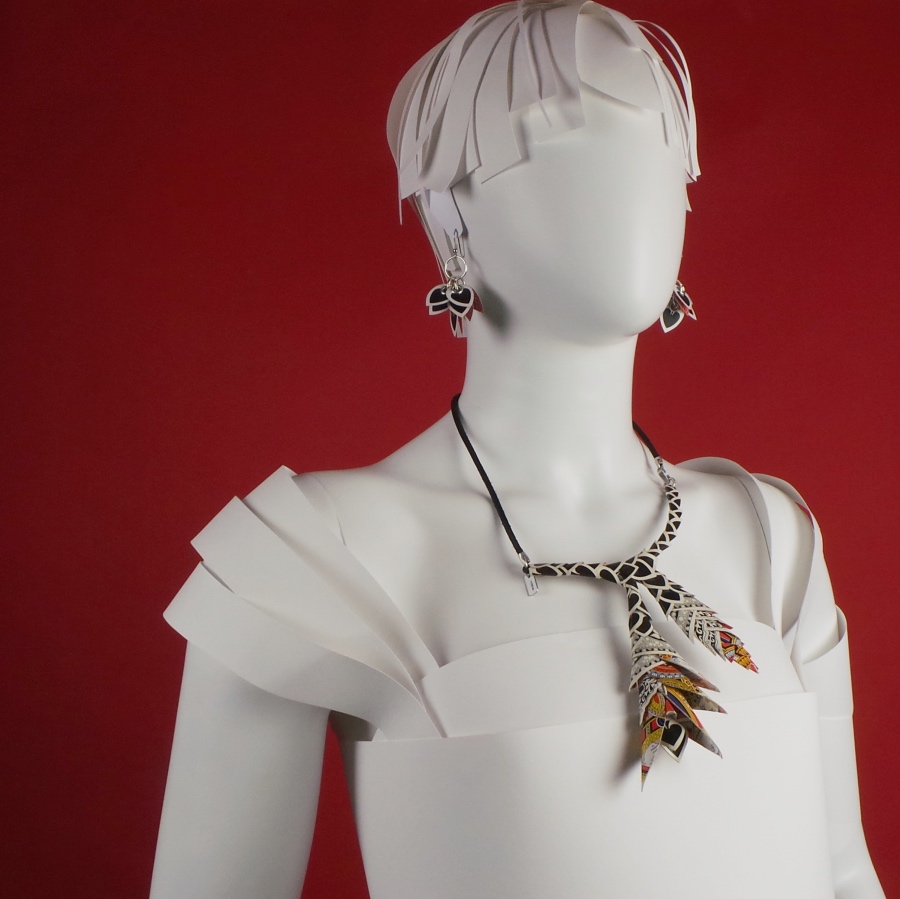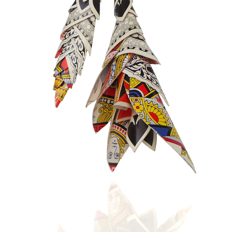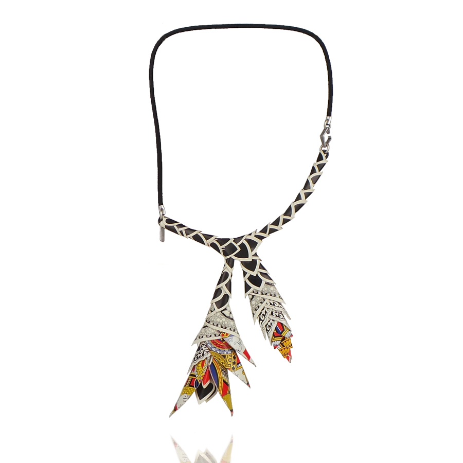 Sculpture necklace made with hand-cut and hand-crafted playing cards.