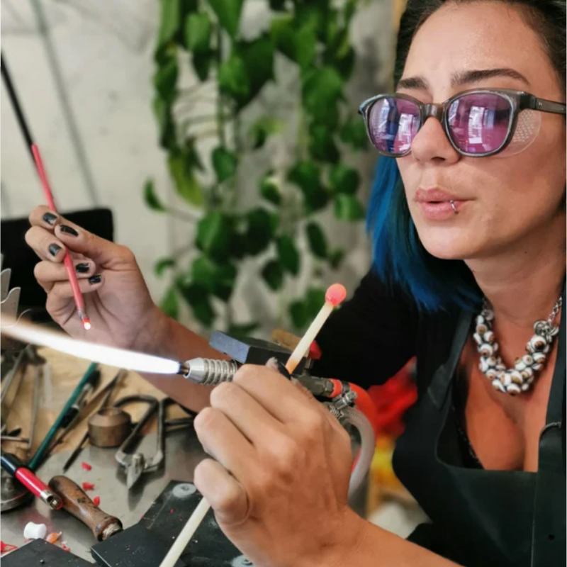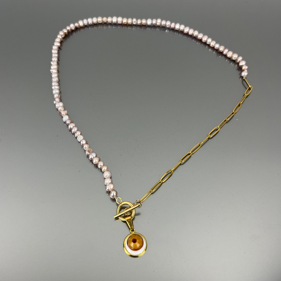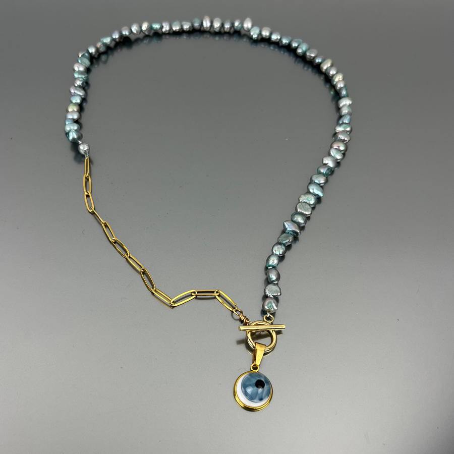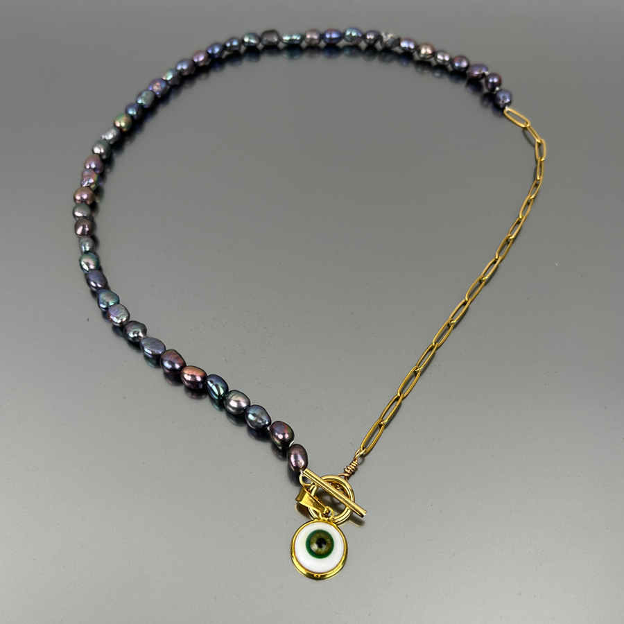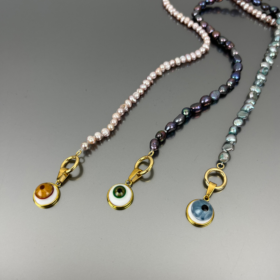 Necklace with colored river pearls, stainless steel and glass eyes made with the Murano lampwork technique.
