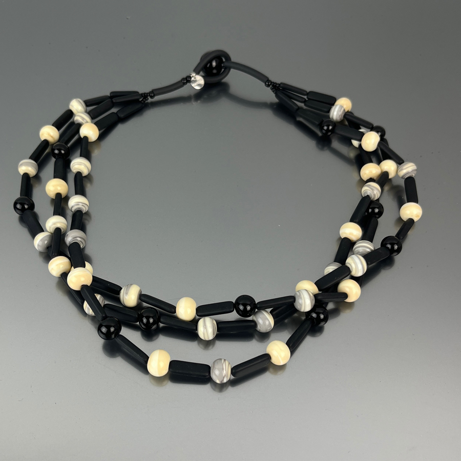The rubber and glass clasp completes a jewel that surprises with its light structure, formal research and extraordinary chromatic vitality. Each necklace tells a perfect balance between essentiality and fantasy.