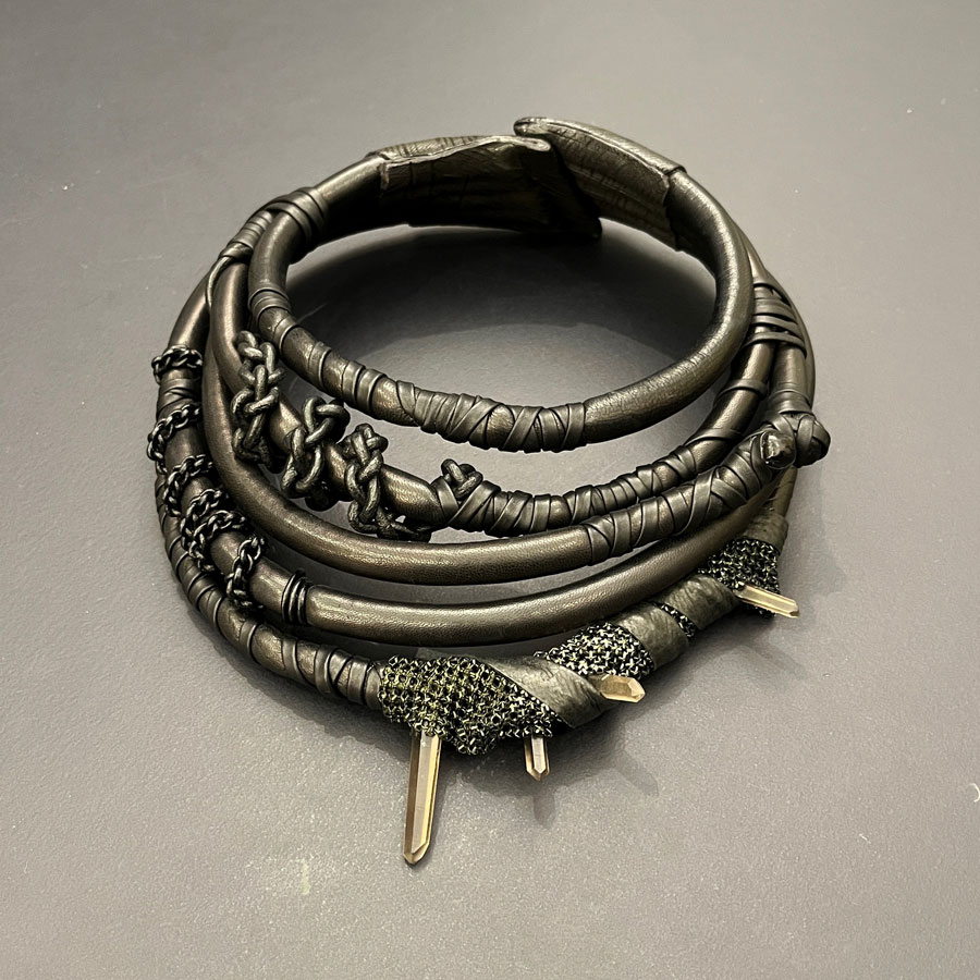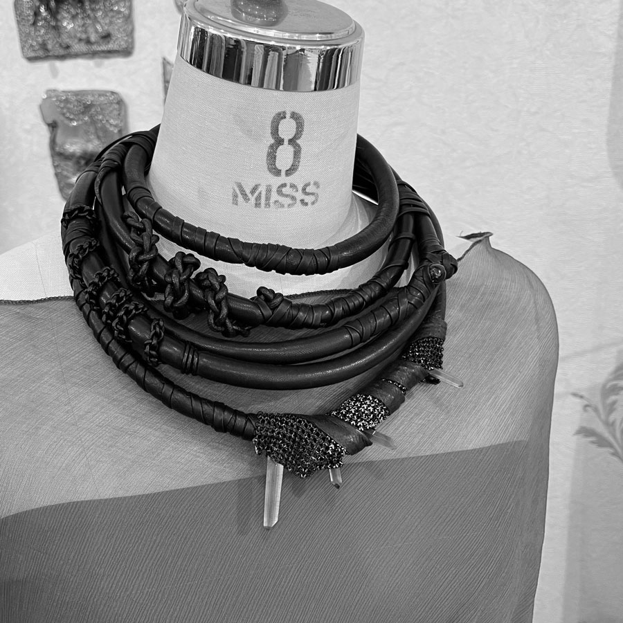 From the Kinky collection, the multi-strand necklace in black leather, quartz and small iron knit details.