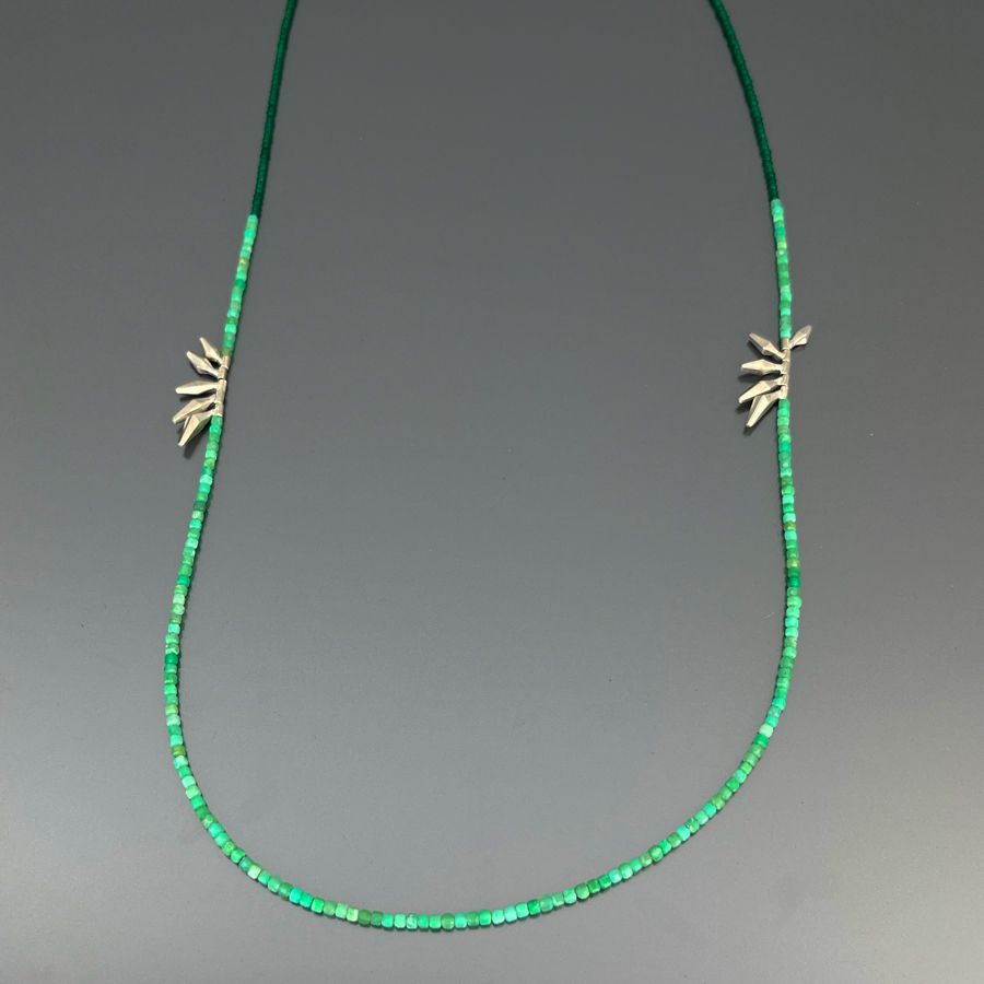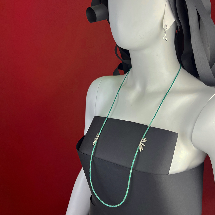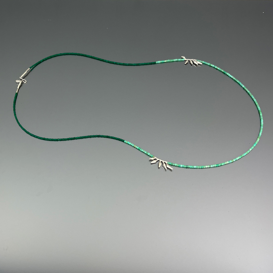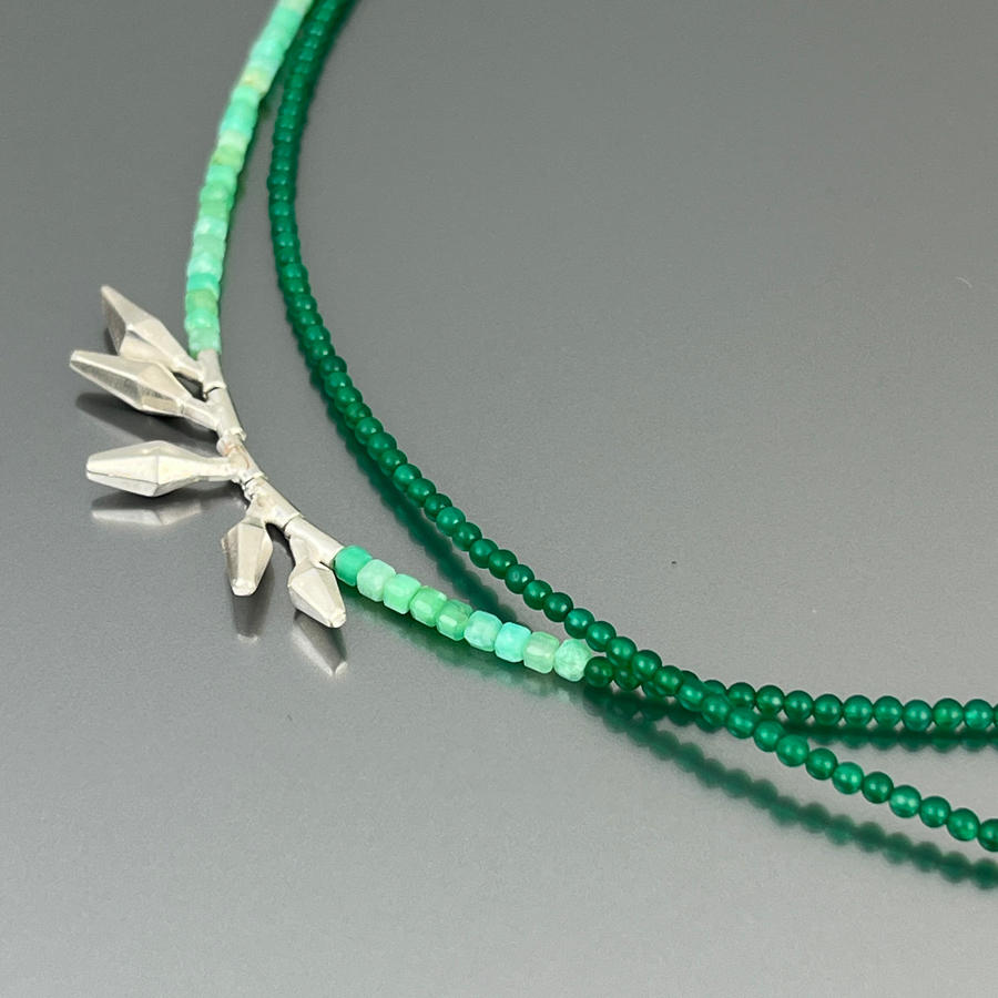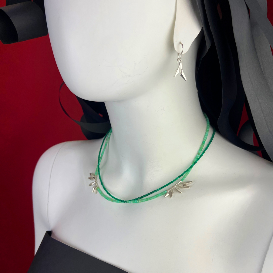 Long necklace in Chrysoprase and green Agate, with small mobile elements and 925 silver clasp