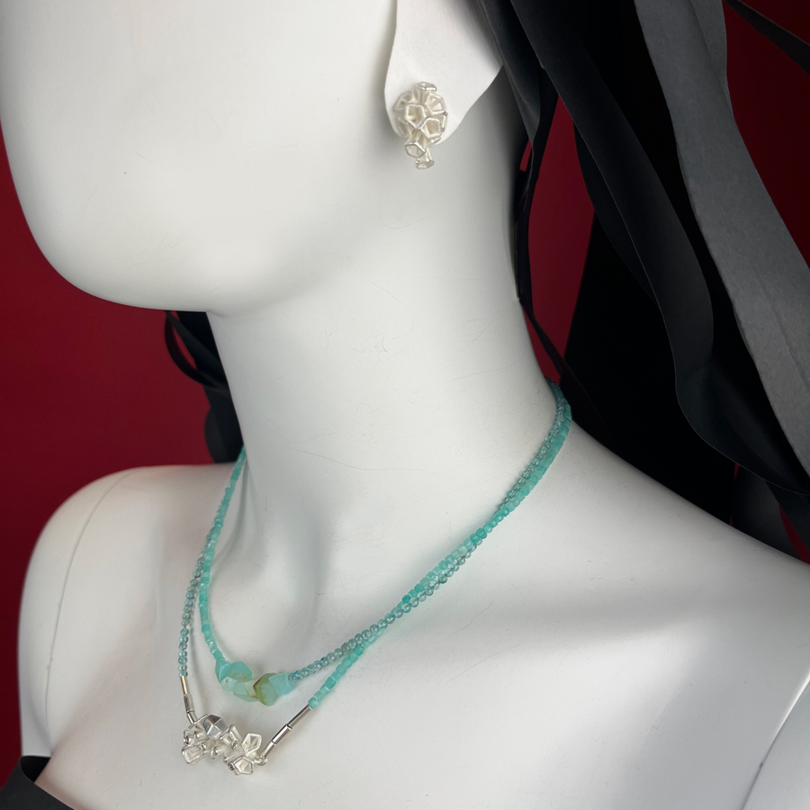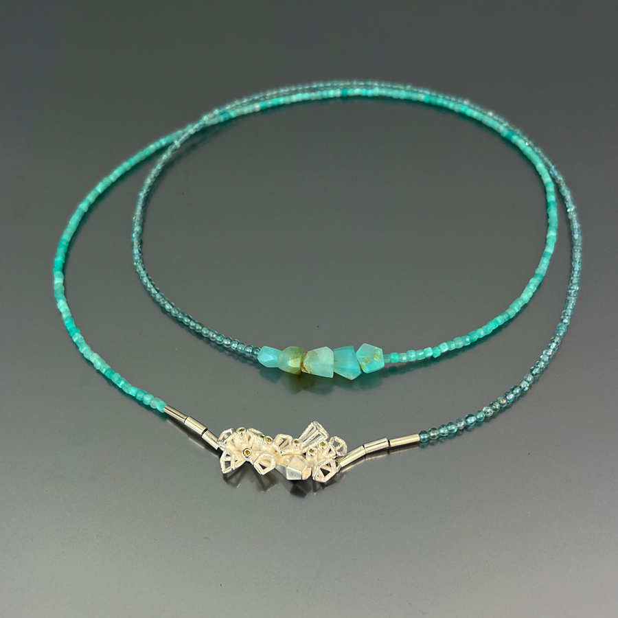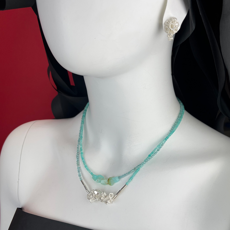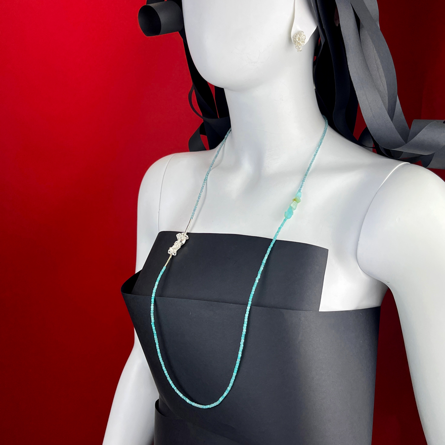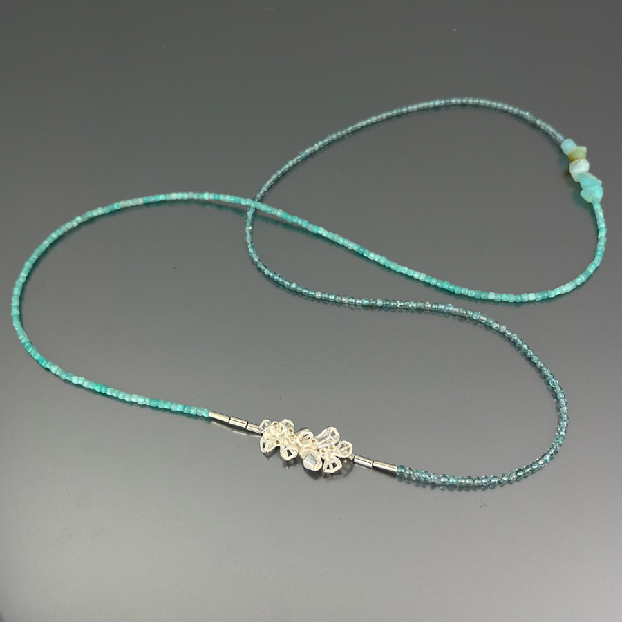 Long necklace in Amazonite and Apatite, with a sculpture element featuring a hidden clasp in 925 silver and small yellow Sapphires set in it.