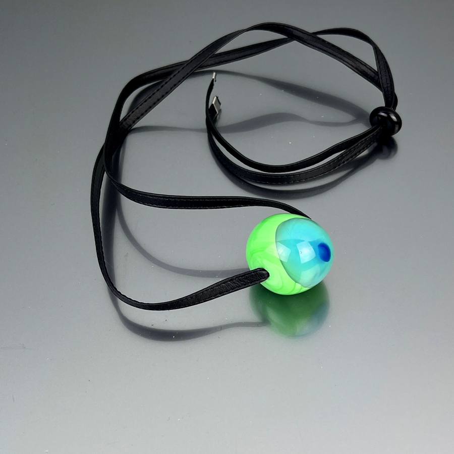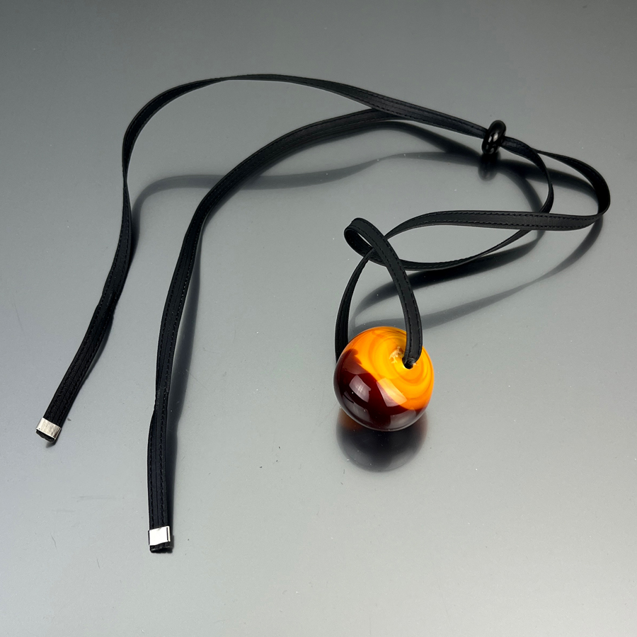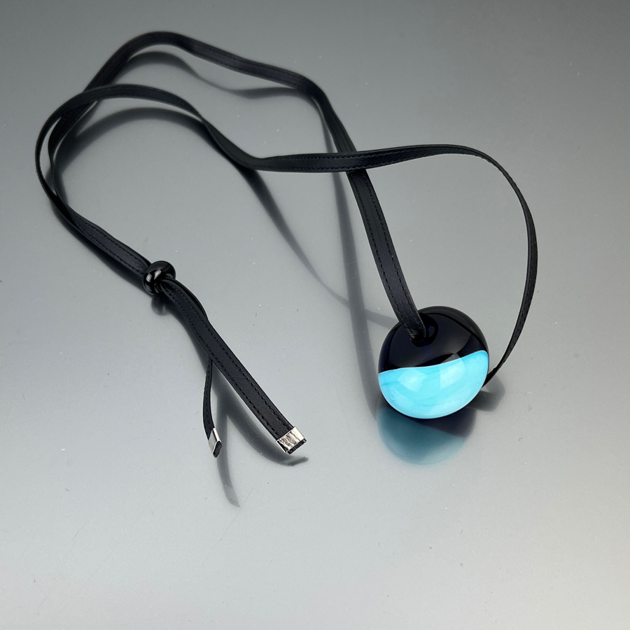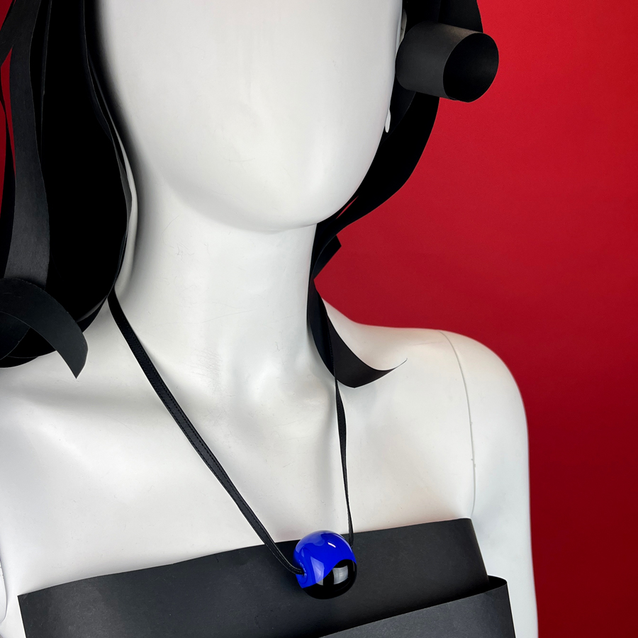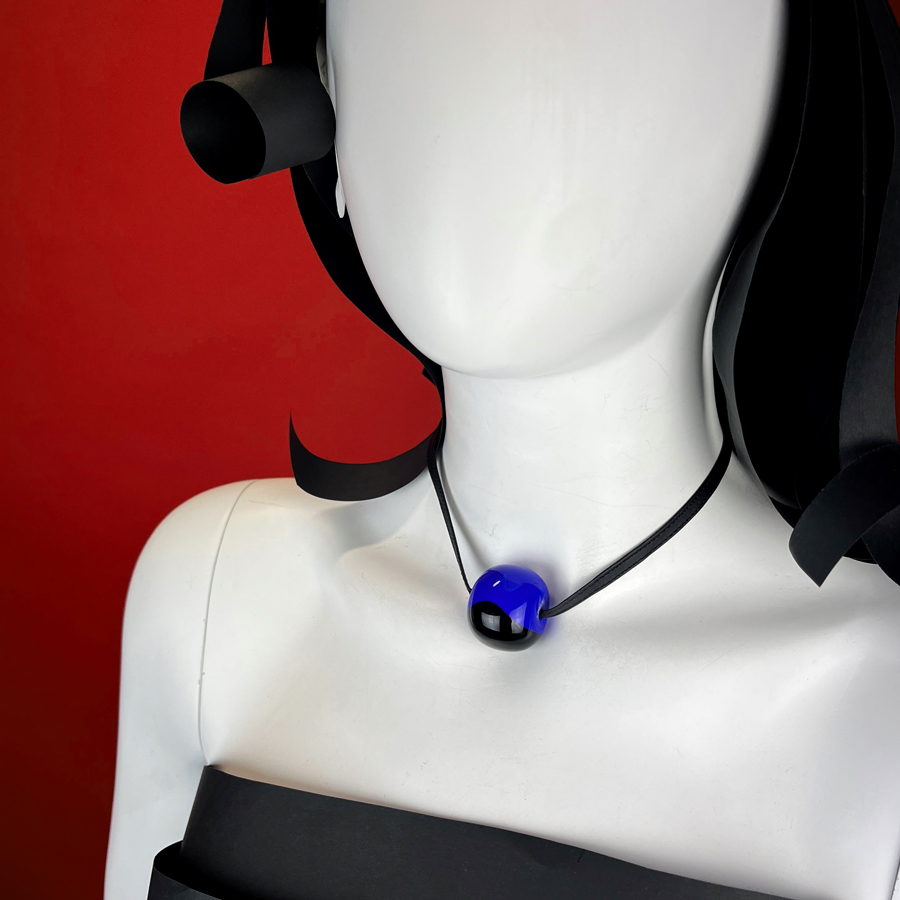 The pendant is combined with a long adjustable leather strap: thanks to a sliding glass pearl, it is possible to adapt its length, allowing it to be worn both as a choker and in a longer version.