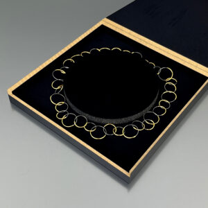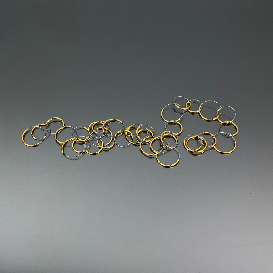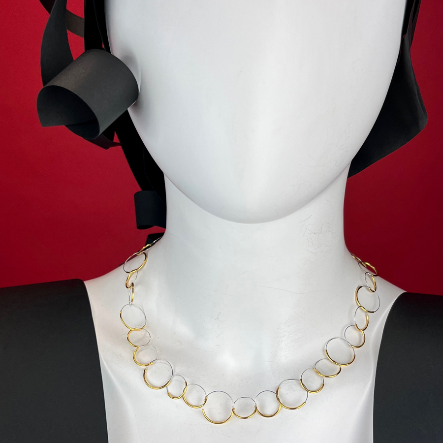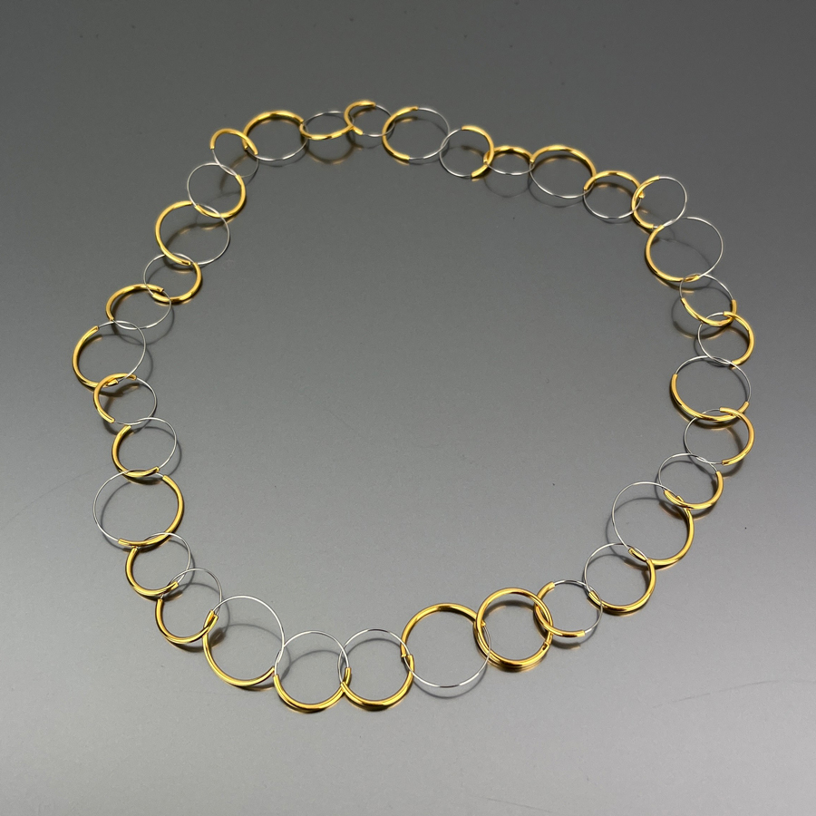 Choker necklace composed of small circles of varying diameters in gold-plated silver and stainless steel.