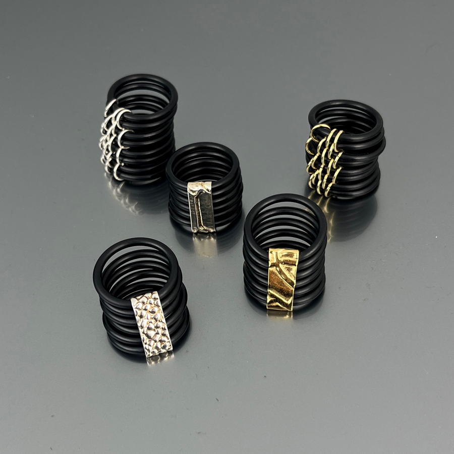 Rubber rings with gold or silver plated brass details.