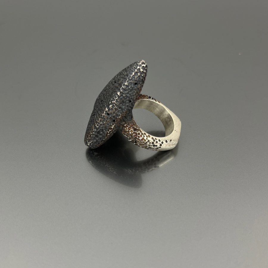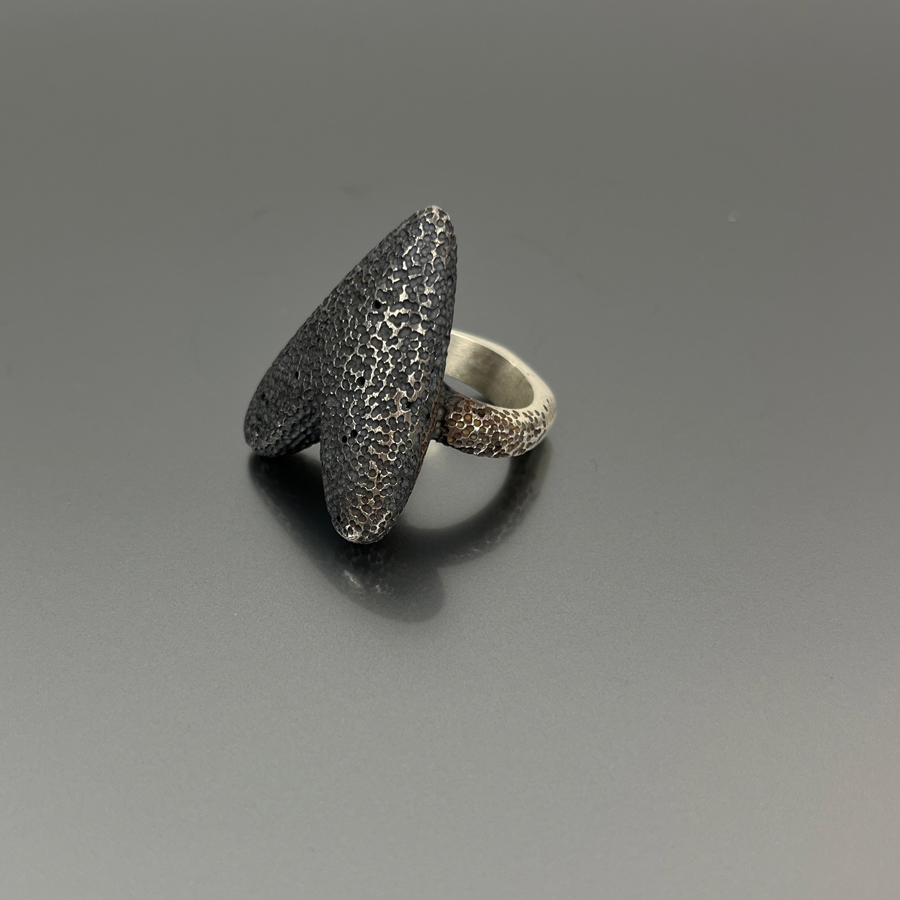 Veronica Peréz creates unique pieces entirely handmade, the large heart ring of the Coralina series is in oxidized silver.