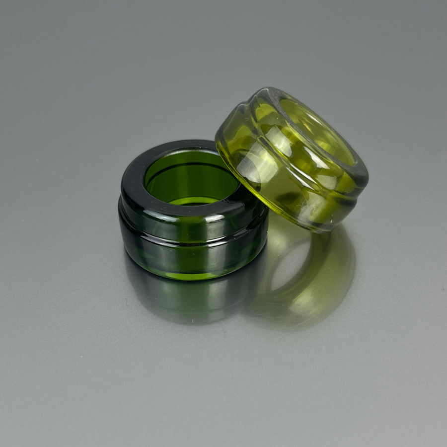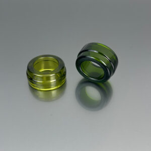 This scrap glass is carefully transformed by combining traditional lampworking and cold-working techniques, creating highly distinctive rings.