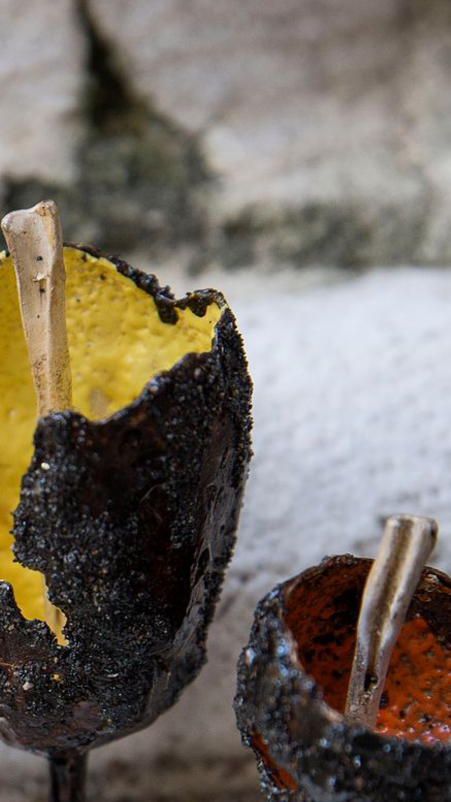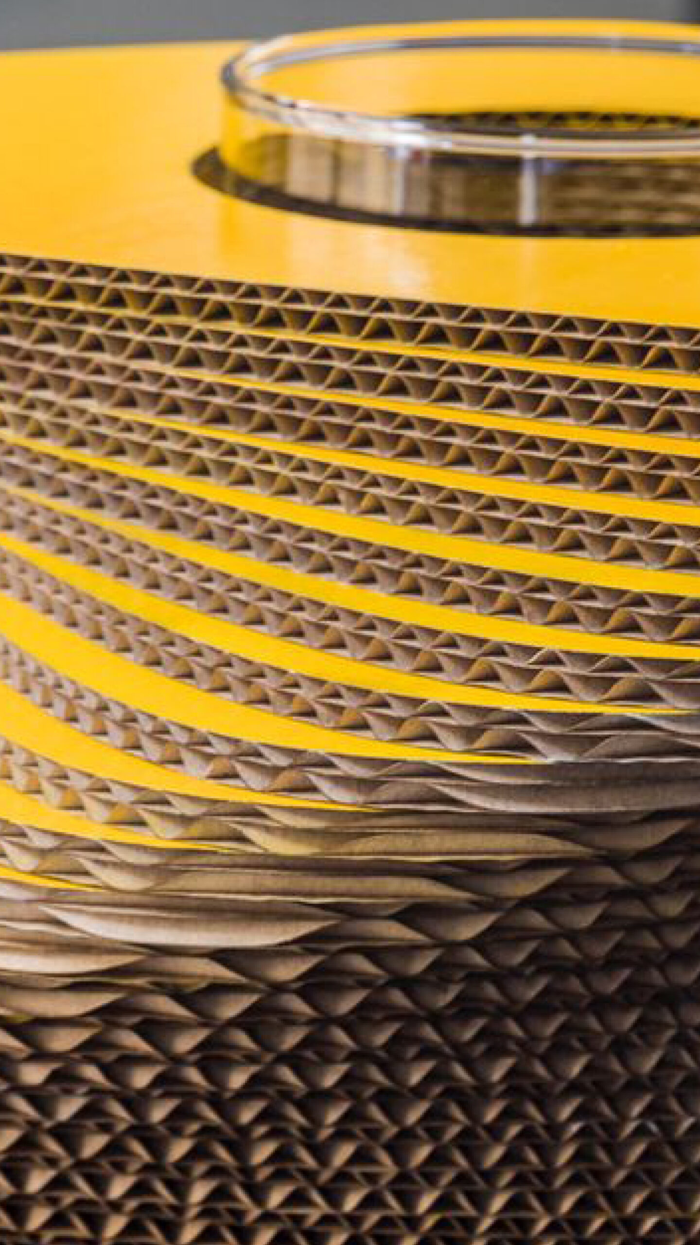 Sculture che racchiudono vasi, progetto realizzato in cartone lavorato e tinto a mano.