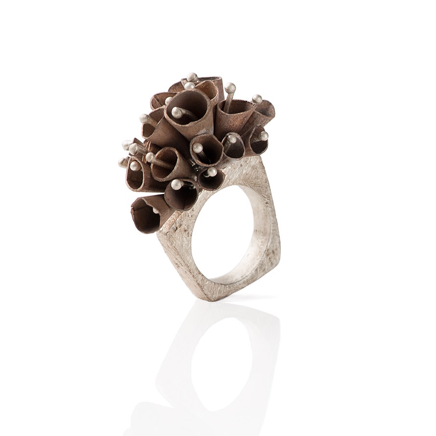 Gioiello realizzato interamente a mano Anello in argento, campanule in rame su perni in argento. Le campanule sono tutte mobili Misura disponibile 12 (misura italiana)