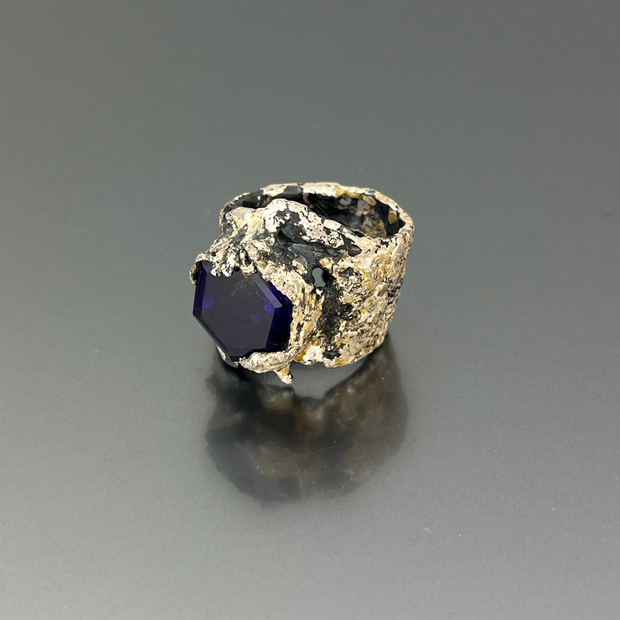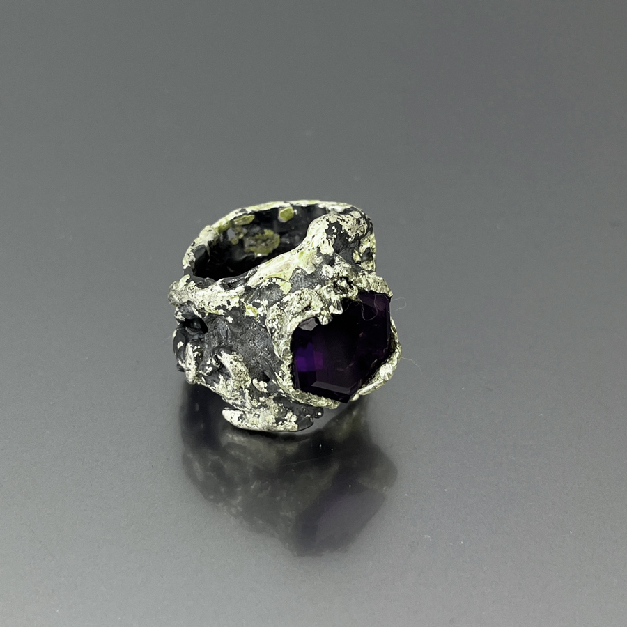 Anello in argento ossidato e con patine. Pietra Ametista lavorata da un forte contrasto con la struttura grazza dell’anello a fascia