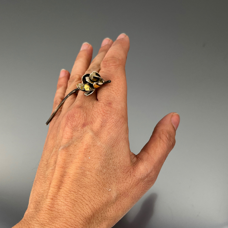 Una piccola scultura facile da indossare, i rami sono leggermente modellabili, per questo l’anello si adatta facilmente a diverse misure.