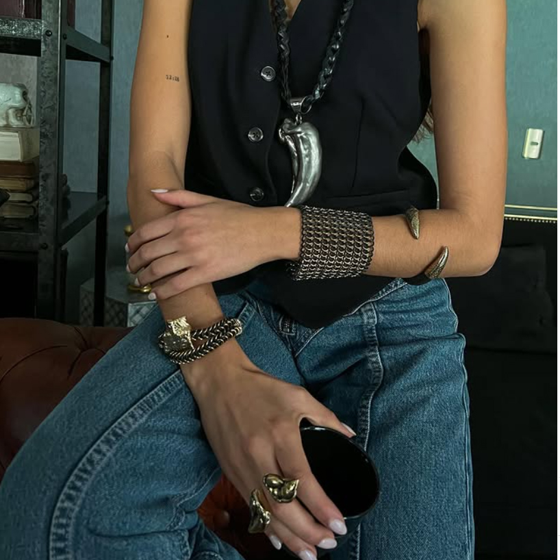 Bracciale a maglie con anelli in ottone placcato oro o placcato argento e gomma.