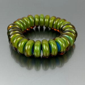 Il bracciale Atollo è in vetro di Murano e le perle, unite da un elastico, sono realizzate interamente a mano con la tradizionale tecnica del vetro a lume nel laboratorio di Marina e Susanna Sent.