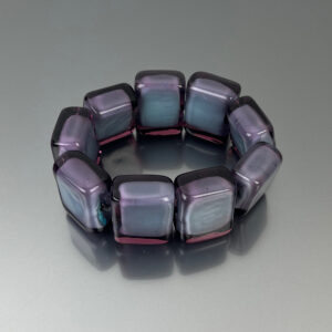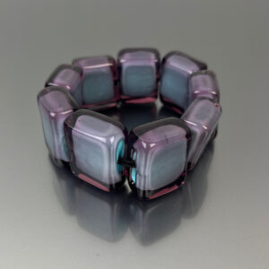 Il bracciale Cubi è in vetro di Murano e gli elementi, uniti da un elastico, sono realizzati interamente a mano con la tradizionale tecnica del vetro a lume nel laboratorio di Marina e Susanna Sent.