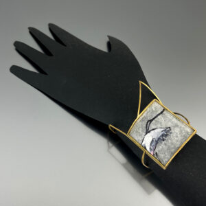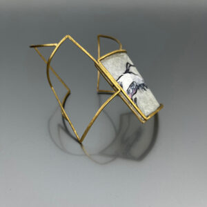 La collezione “Give crane a chance” nasce dopo un viaggio in Giappone, dove l’artista ha scoperto il gofun, pigmento bianco ricavato da ostriche polverizzate che viene da subito integrato nella sua ricerca pittorica applicata alla gioielleria.