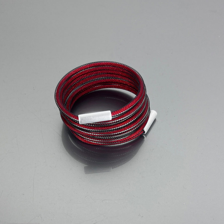 Rete in nylon con all’interno un cordoncino colorato in seta e un filo in acciaio armonico che rende il bracciale molto facile da indossare.