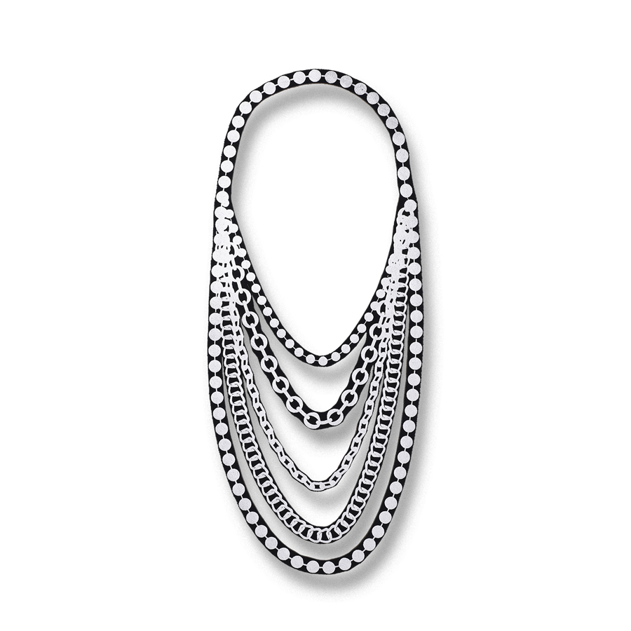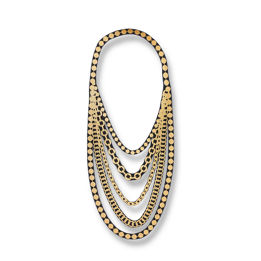 Le collane di Uli interpretano l’amore per le pietre preziose antiche e le perle in contrasto con le grosse catene. Tutti i pezzi sono sapientemente realizzati a mano in serigrafia su materiali morbidi e leggeri.