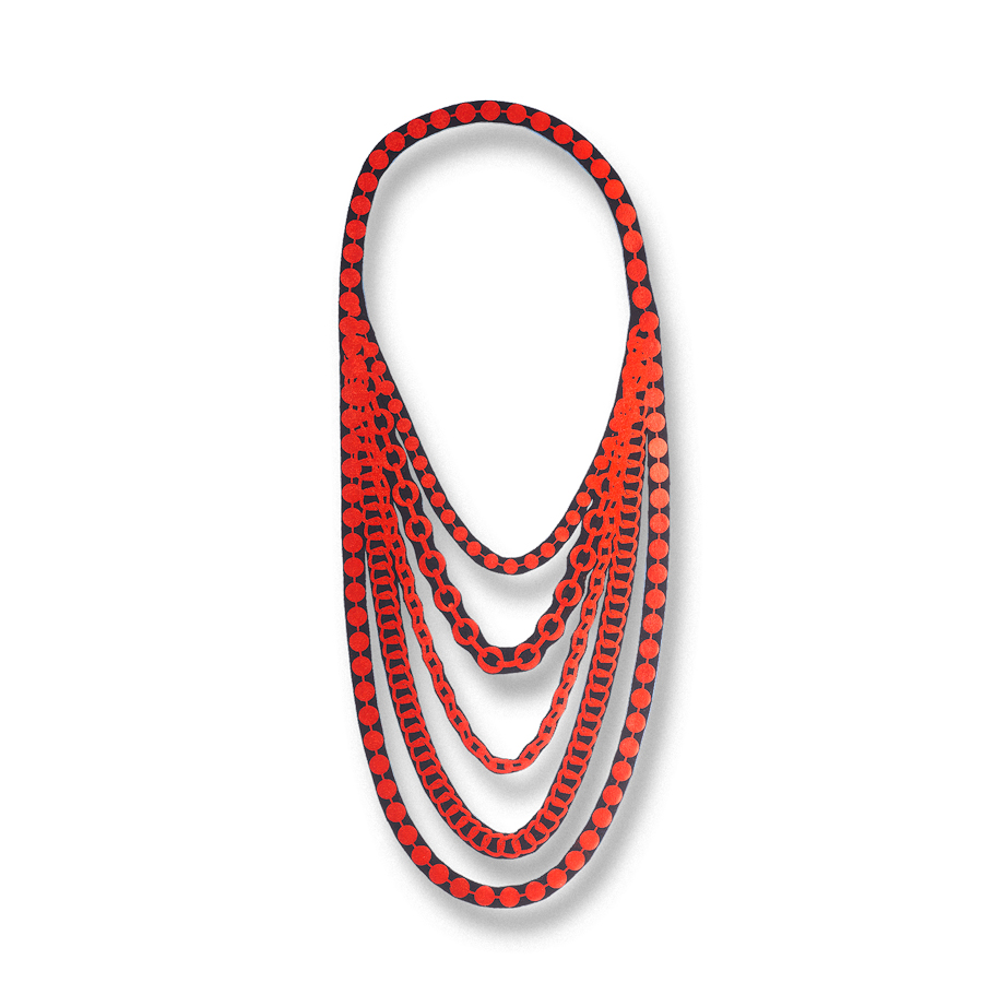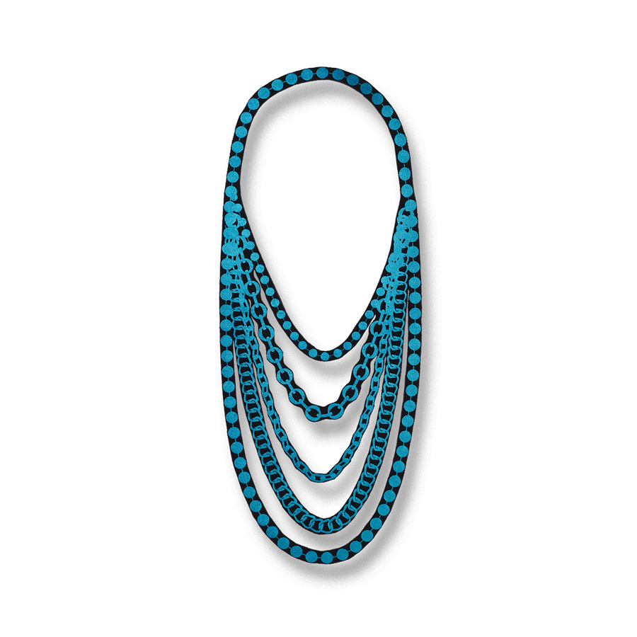 Collana in tessuto stampato di grande effetto ma confortevole e leggera.