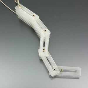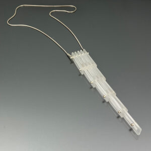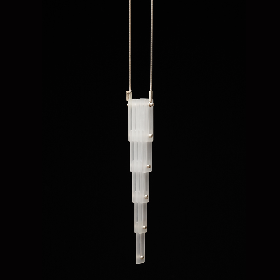 La collana Empire è composta da 15 elementi mobili in vetro borosilicato, uniti da 6 piccole “traverse” in argento e una catena anch’essa in argento. Il vetro è tagliato con un getto d’acqua, levigato e rifinito a mano per creare l’effetto bianco satinato. Questa collana si ispira ai grattacieli Art Déco di New York e Chicago.
