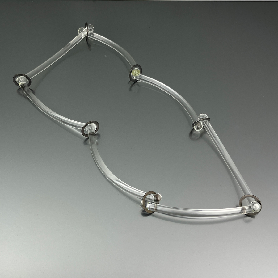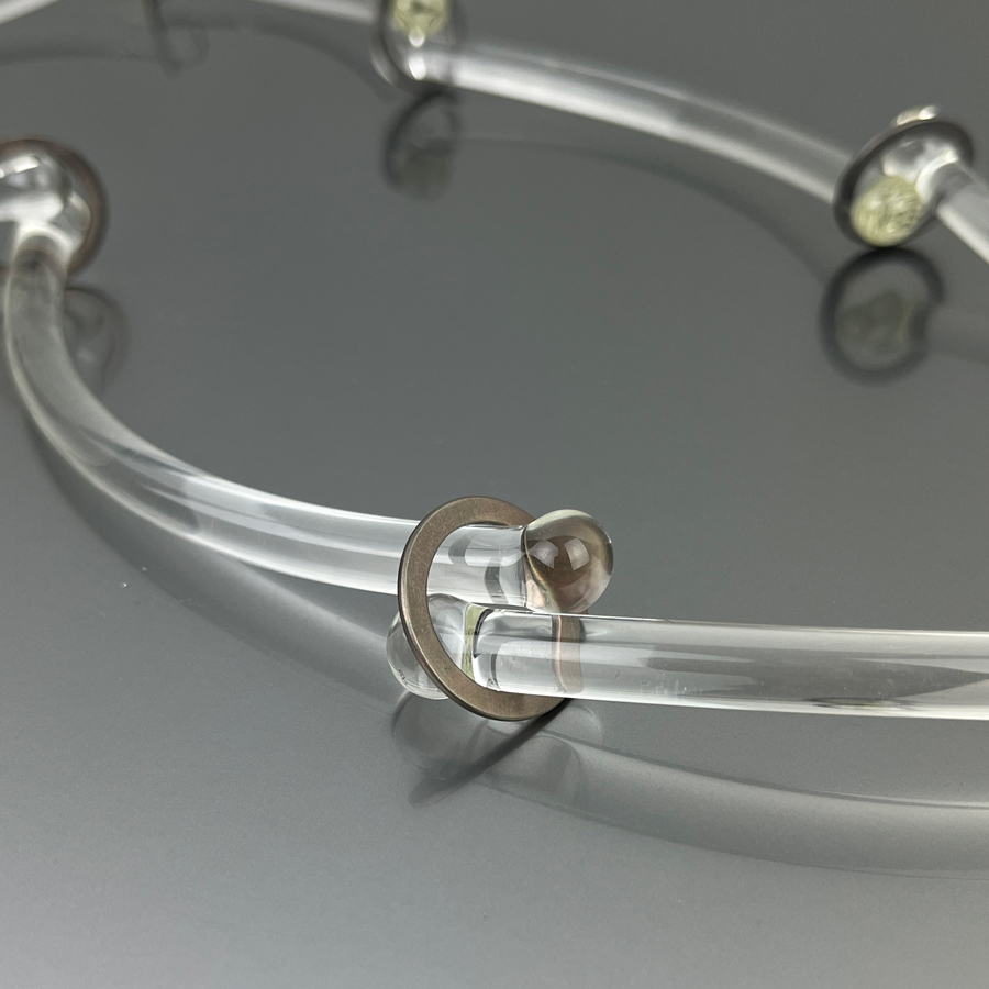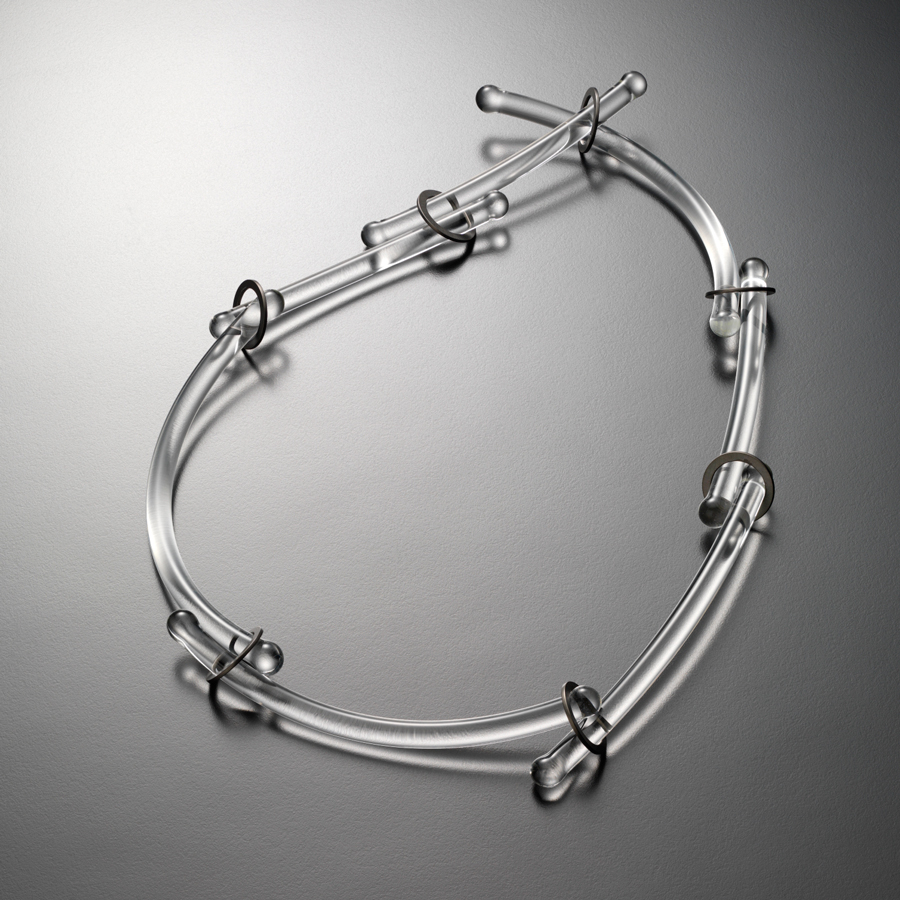 La collana è realizzata con elementi in vetro borosilicato e cerchi in titanio.