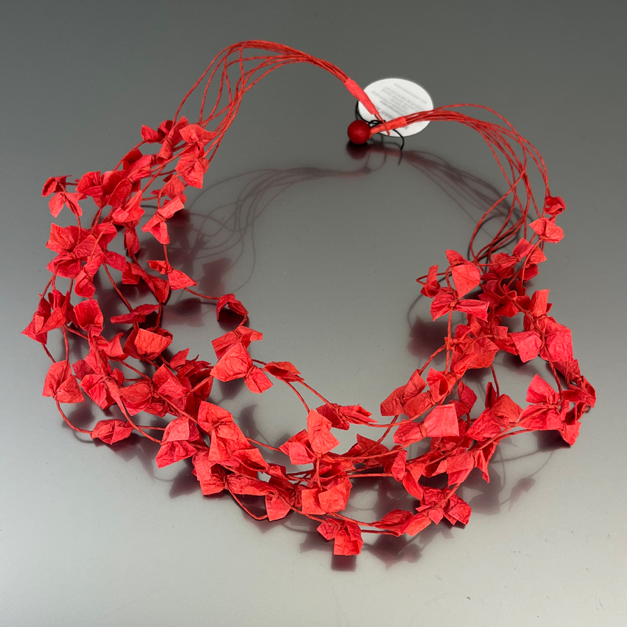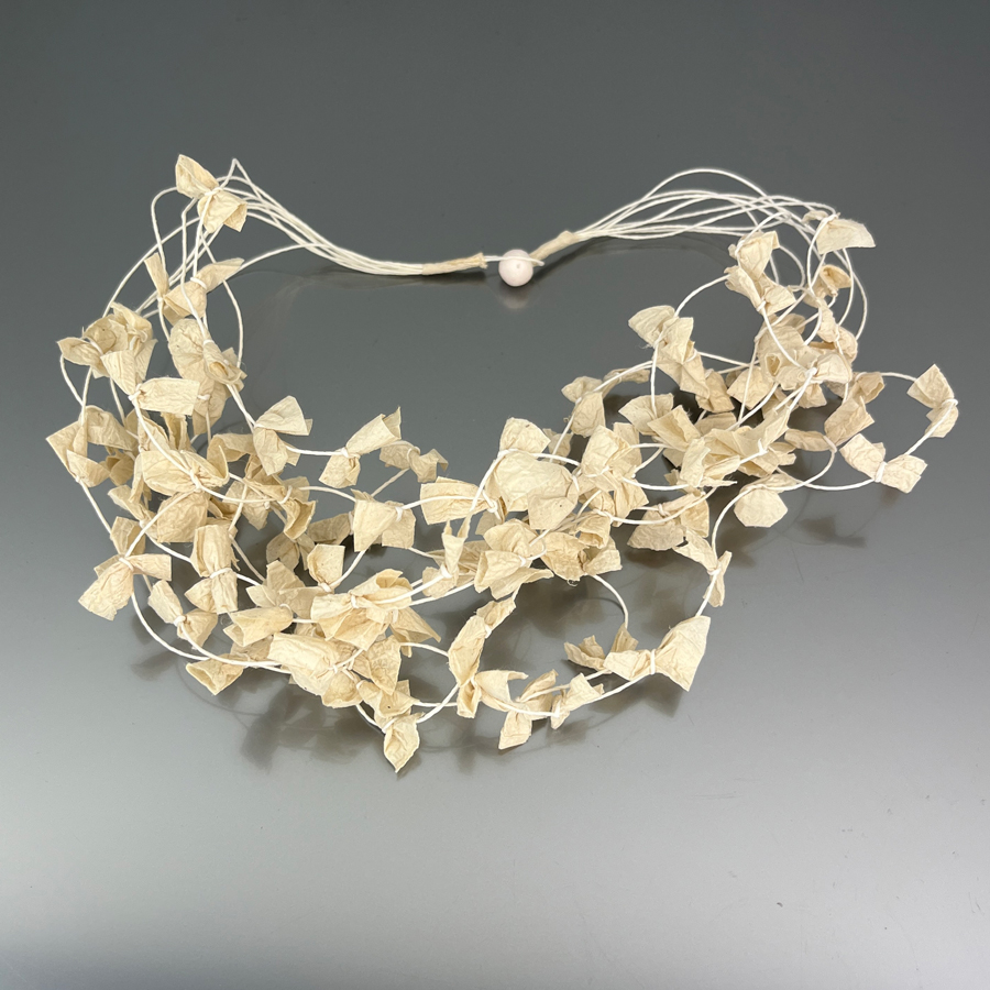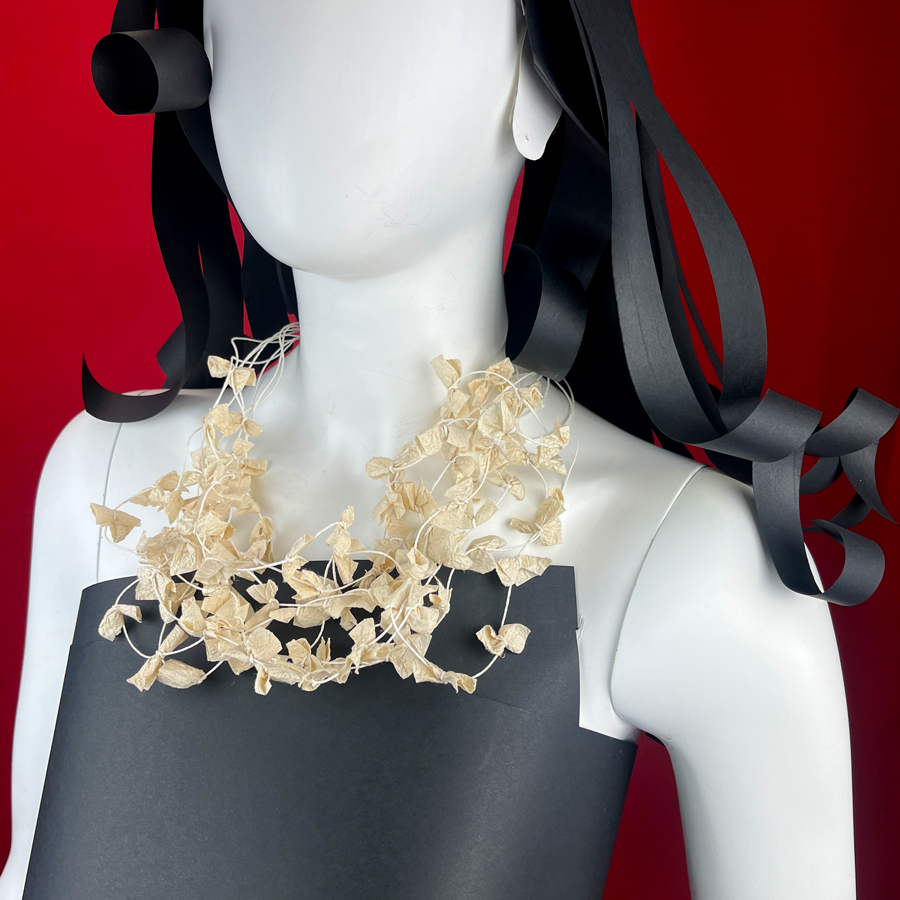 Voluminosa ma leggera, la collana Loop è un richiamo alla natura, ed è realizzata a mano da Ana Hagopian, artista argentina che trasforma la carta in emozione.