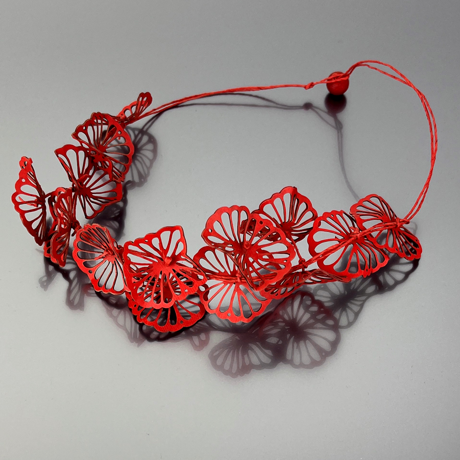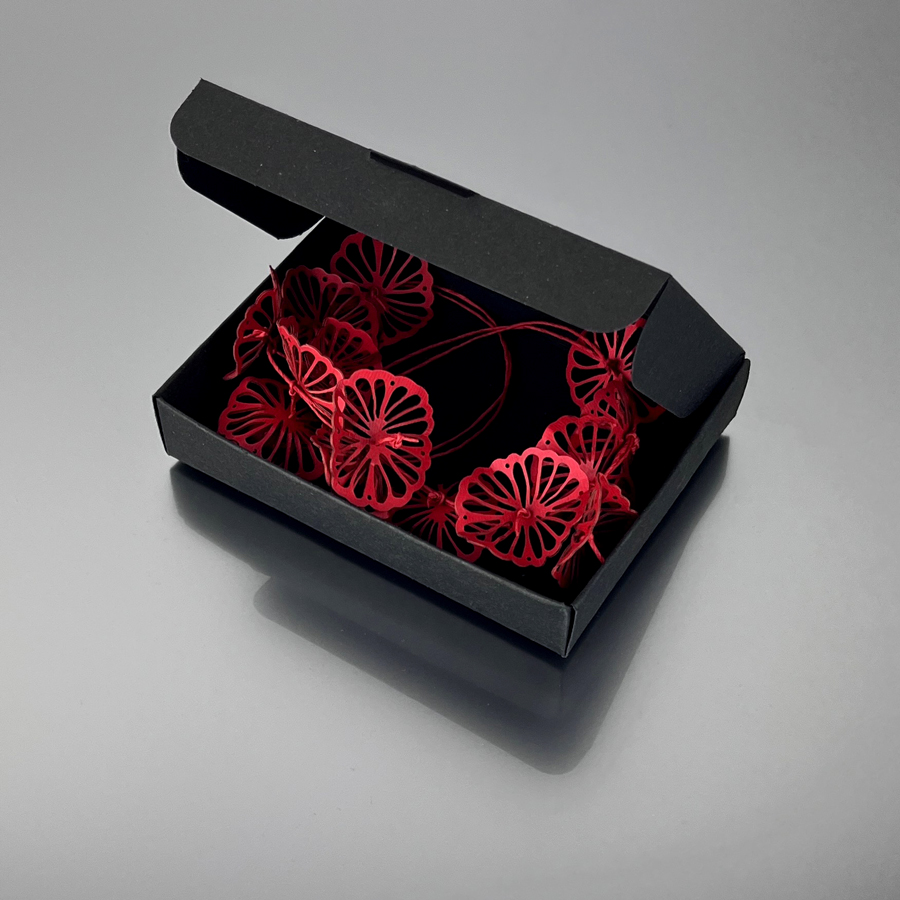 Questa collana in cartoncino trattato, a tema floreale, firmata Ana Hagopian,