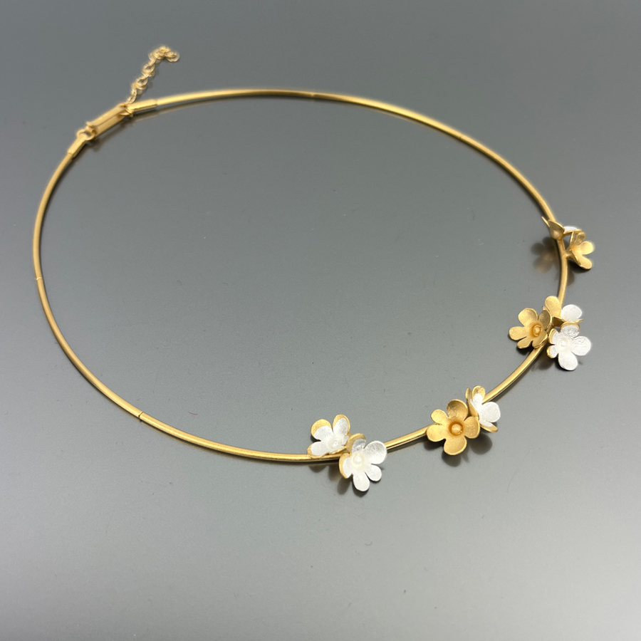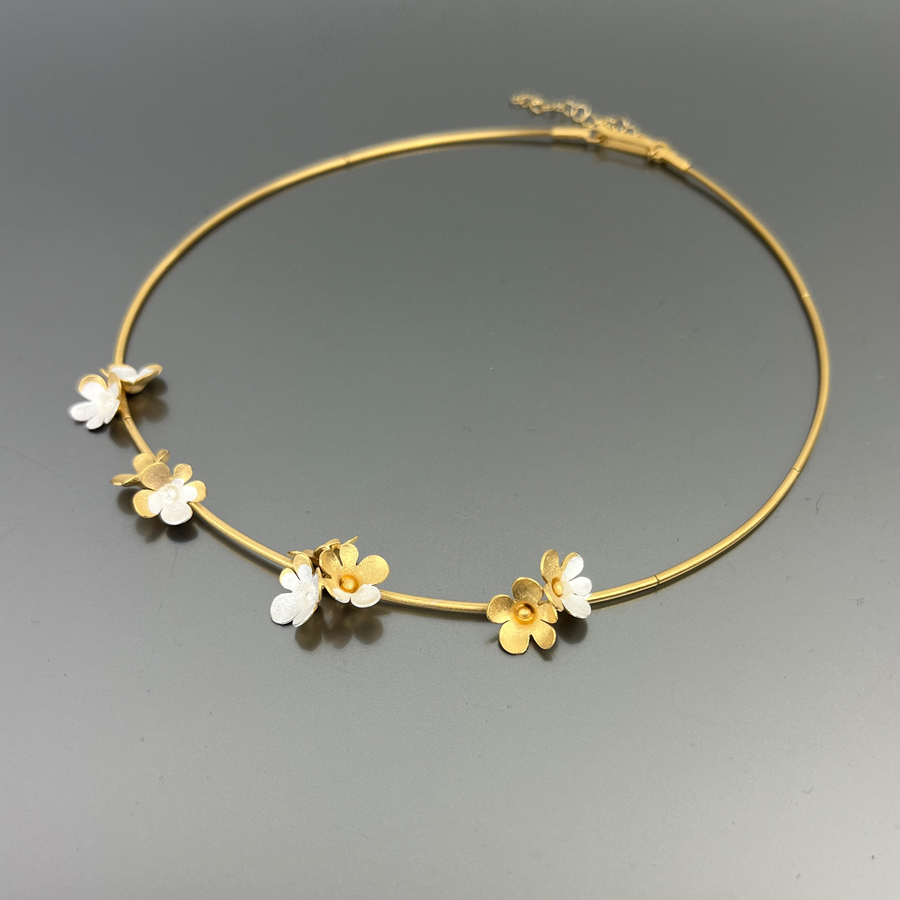 Elegante girocollo in argento placcato oro. Il gioiello è composto da sottili tubi curvati montati su cavetto in acciaio. I fiorellini sono saldati in piccoli gruppi di due o tre elementi. Lunghezza totale aperta 45 cm